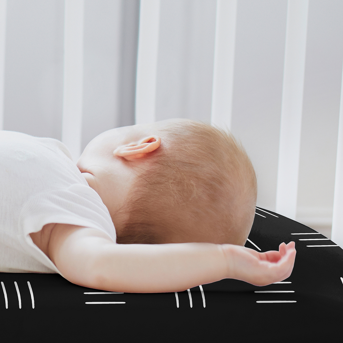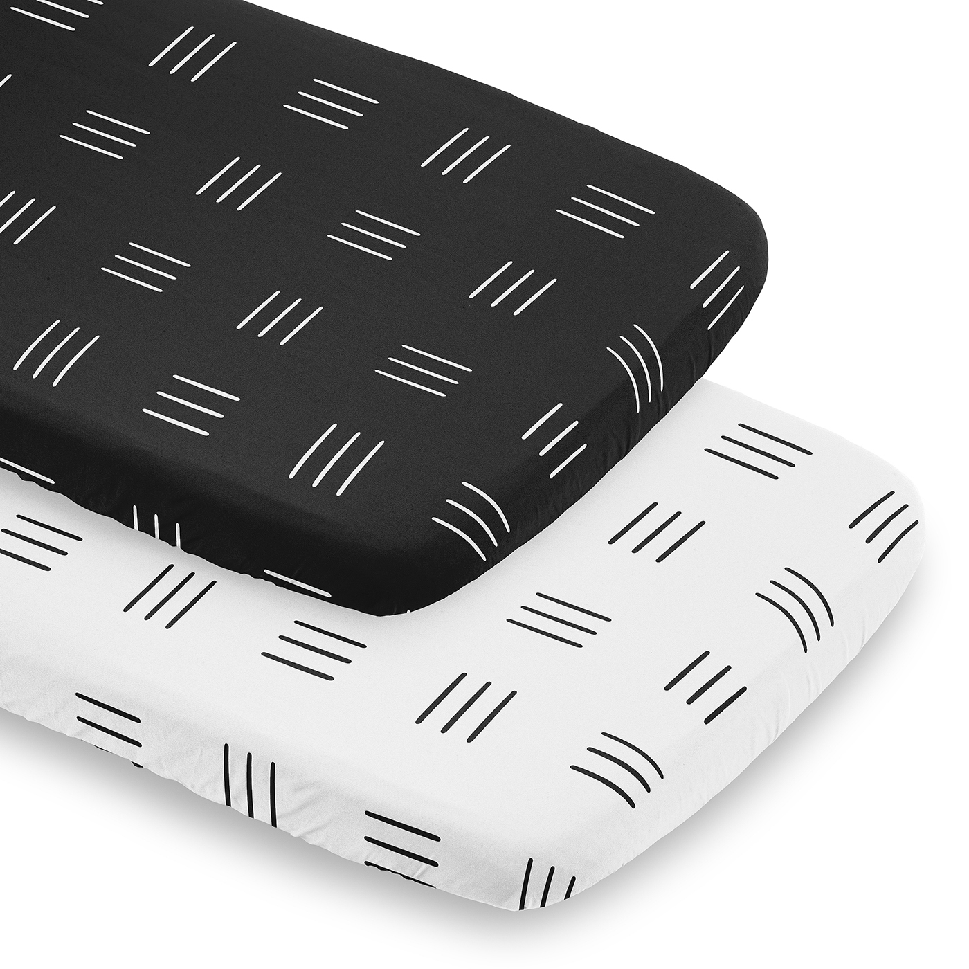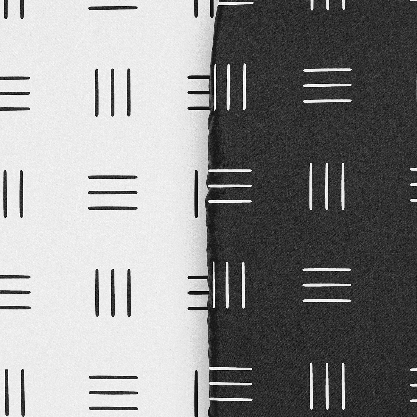 2 Pack Bassinet Sheet Set: 32in. x 19in. x 4in. each. WILL NOT FIT STANDARD SIZE OR MINI CRIBSPack of 2 Brushed Microfiber Sheets Set - (1) Black and White Boho Mudcloth Print paired with (1) White and Black Bohemian Woodland Tribal Southwest Mud Cloth Hatch Triple Line Print Add a pack and play bassinet sheet to your list of must haves for your newborn! This rectangle bassinet sheet is stretchy and comfortable to give your infant the perfect setting for a good night’s rest. It’s thoughtfully designed with elastic sewn around the entire bottom edge of the sheet for a secure fit on most standard sized bassinets, pack and play or play yard bassinets, cradles, beside sleepers, and oval, hourglass and rectangular mattress shapes.Remember, you can never have too many sheets! Purchase a pack of two fitted basinet sheets to be able to have spares close at hand to swap between washes and to be prepared if an accident happens in the bassinet in the middle of the night. Get an extra two piece set to make sure you never run out of clean sheets. Easy machine washable, tumble dry low.Makes the perfect gift with one of Sweet Jojo Designs coordinating changing pad covers, nursing pillow covers, nursery room decoration accessories and window treatments. And when your little one is ready to move into a crib or mini crib, we have matching bedding sets for their new sleep space too! Include a sheet set in your baby shower gift basket, gender reveal presents or add to your baby gift registry to ensure you have all you need to complete your Sweet Jojo Designs baby bed room look.Item# 2P-BS-Hatch-BK-WH