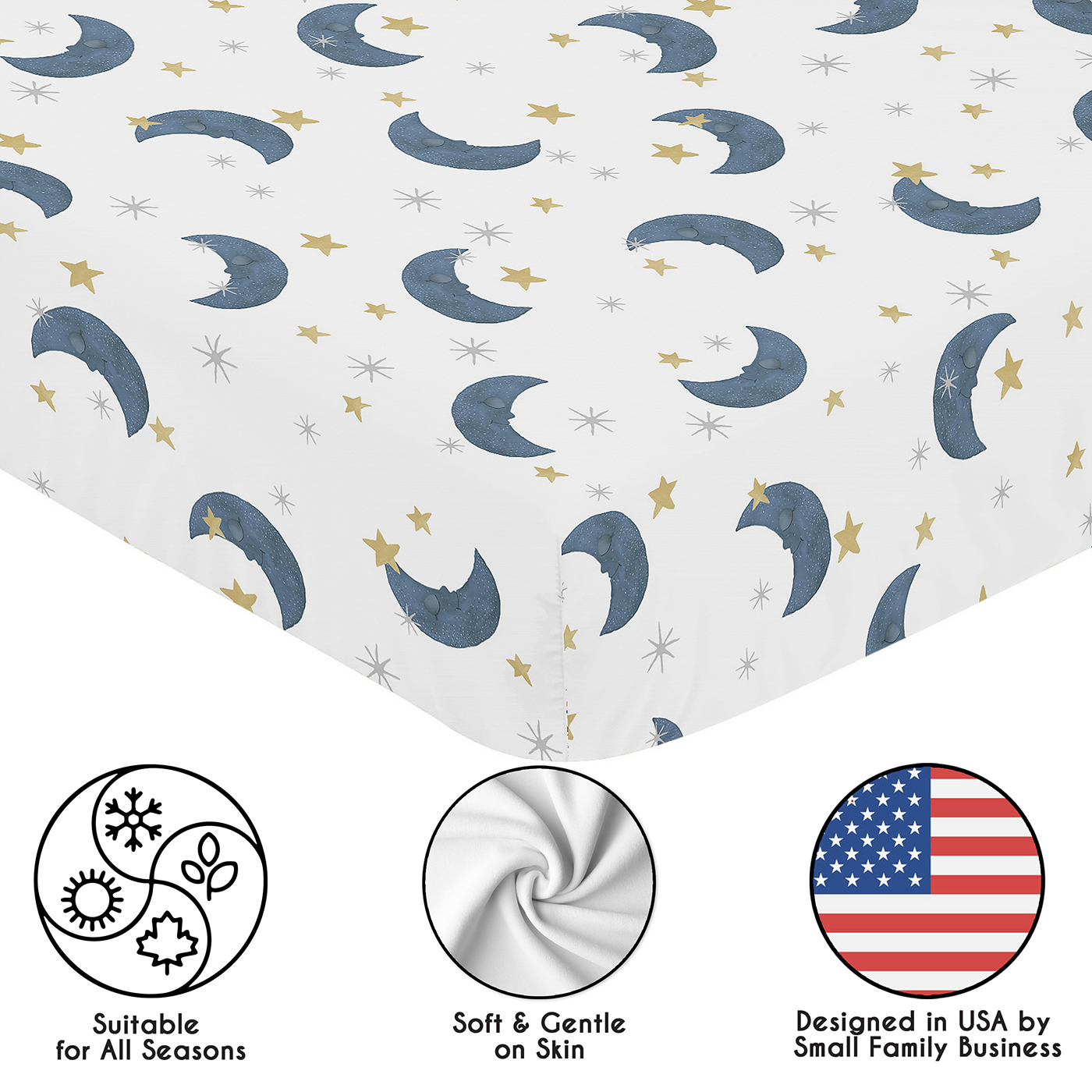 SNUG FIT: Includes: (2) Baby Crib Sheets: 52in. x 28in. x 8in. Our newborn standard crib sheets fit snugly, with premium elastic sewn around the entire bottom edge for a secure fit on most standard sized cribs and toddler beds, to reduce shifting and bunching. This classic microfiber cribsheets set feature solid navy paired with a blue, gray, gold and grey celestial, stars and moons print to match our moon bear collection and is gentle on delicate skin to foster a soothing sleep environment.DESIGNED IN THE USA: By real parents who understand the need for comfort, practicality and style. Sweet Jojo Designs is a small, women owned business. The mom's on our team know a crib mattress sheet is first priority for your baby essentials to ensure a restful night of sleep. We use top fabrics & designs to create soft crib sheets that are stretchy & comfortable for your infant or toddler. We've studied the latest trends in space crib sheets for baby girl & boy to bring you the finest product.SAFE & DURABLE: Sweet Jojo Designs is a proud Baby Safety Alliance member and rigorously tests products to meet or exceed CPSC safety standards. Our breathable crib sheets are designed with busy parents in mind. Quick to change, easy machine washable and tumble dry on low. The high quality stitching and fabric ensure long-lasting use and will hold up wash after wash. Use one crib sheet in your newborns bed and have spares nearby to swap in between washes & to be prepared if an accident happens.PERFECT GIFT: Add baby unisex crib sheets to your list of must haves! Including a baby fitted crib sheet on your gift registry, in a baby shower gift basket or as a gender reveal present is an easy way to prepare for a baby's arrival. Whether it's nap time, bedtime, or an unexpected mess, having extras of these baby mattress sheets make changes effortless so you can focus on what matters most to you & your family. And remember, you can never have too many baby crib sheets or toddler bed sheets!NURSERY DESIGN MADE EASY: If you have a nursery to decorate, we have endless coordinating options to help. A nursery theme can be planned entirely around baby sheets for crib. Sweet Jojo Designs makes decorating simple with matching crib bedding sets, toddler bedding sets, crib sheet set, crib bed sheets, changing pad covers, milestone blankets, wall decor, decorative accessories, swaddles, and window treatments to make sure you have all you need to complete the look of your baby room. Item# 2P-CS-MoonBear-PRT