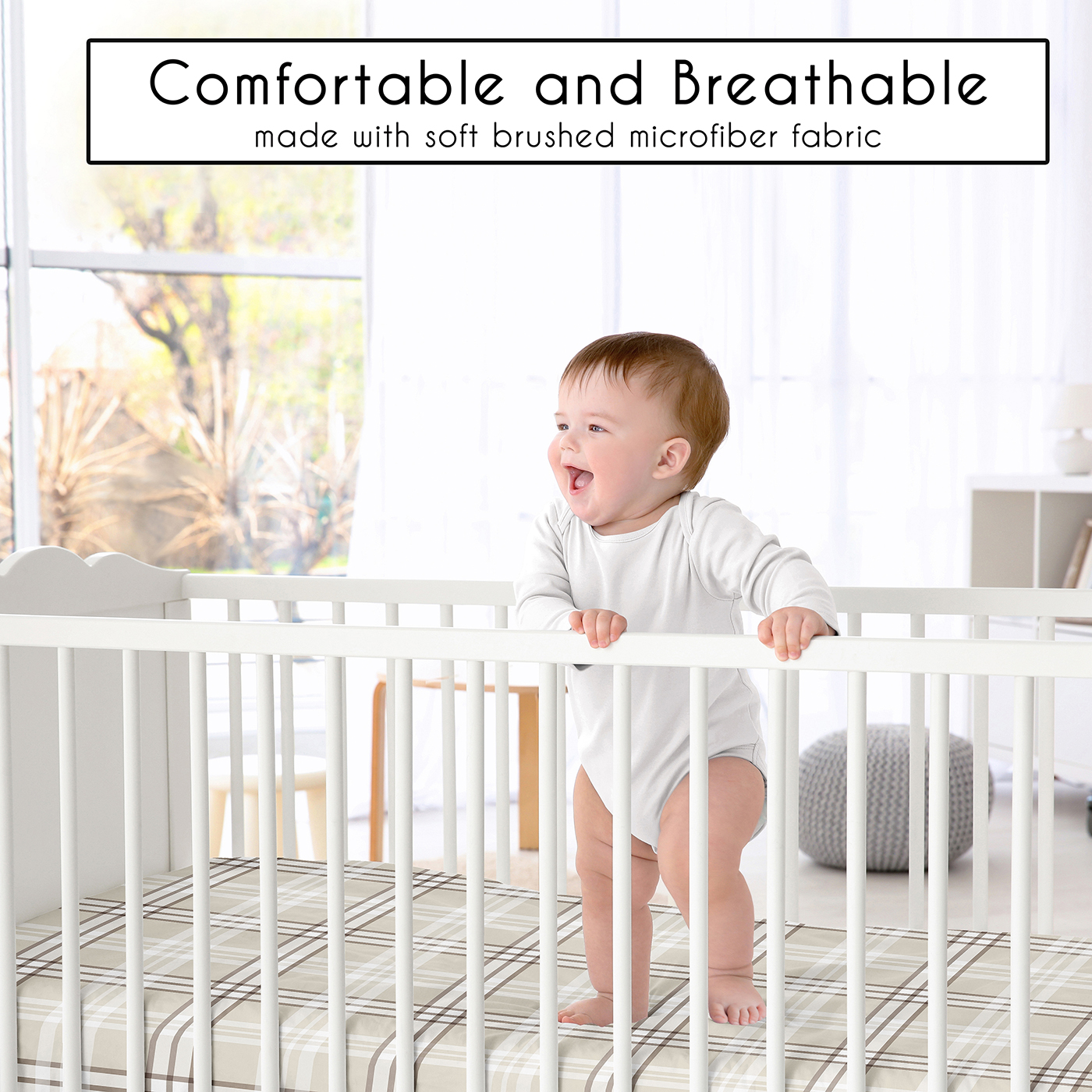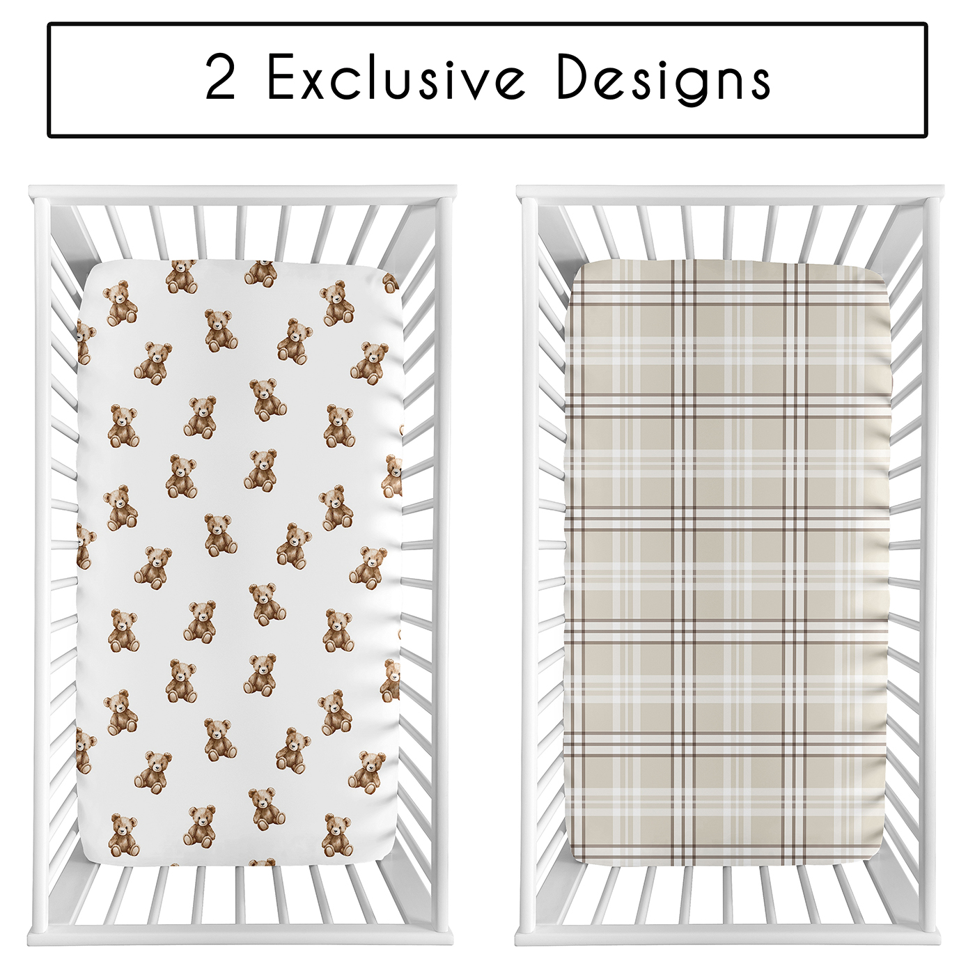 SNUG FIT: Includes: (2) Baby Crib Sheets: 52in. x 28in. x 8in. Our newborn standard crib sheets fit snugly, with premium elastic sewn around the entire bottom edge for a secure fit on most standard sized cribs & toddler beds, to reduce shifting and bunching. This microfiber cribsheets set features an exclusive design of a taupe plaid pattern paired with a soft neutral brown, minimal, vintage, traditional cozy teddy bears print & is gentle on delicate skin to foster a soothing sleep environment.DESIGNED IN THE USA: By real parents who understand the need for comfort, practicality, and style. Sweet Jojo Designs is a small, women owned business. The mom's on our team know a crib mattress sheet is first priority for your baby essentials to ensure a restful night of sleep. We use top fabrics and designs to create soft crib sheets that are stretchy and comfortable for your infant or toddler. We've studied the latest trends in teddy bears crib sheets for baby to bring you the finest product.SAFE & DURABLE: Sweet Jojo Designs is a proud Baby Safety Alliance member and rigorously tests products to meet or exceed CPSC safety standards. Our breathable crib sheets are designed with busy parents in mind. Quick to change, easy machine washable and tumble dry on low. The high quality stitching and fabric ensure long-lasting use and will hold up wash after wash. Use one crib sheet in your newborns bed and have spares nearby to swap in between washes & to be prepared if an accident happens.PERFECT GIFT: Add unisex baby crib sheets to your list of must haves! Including a baby fitted crib sheet on your gift registry, in a baby shower gift basket or as a gender reveal present is an easy way to prepare for a baby's arrival. Whether it's nap time, bedtime, or an unexpected mess, having extras of these baby mattress sheets make changes effortless so you can focus on what matters most to you & your family. And remember, you can never have too many baby crib sheets or toddler bed sheets!NURSERY DESIGN MADE EASY: If you have a nursery to decorate, we have endless coordinating options to help. A nursery theme can be planned entirely around baby sheets for crib. Sweet Jojo Designs makes decorating simple with matching crib bedding sets, toddler bedding sets, crib sheet set, crib bed sheets, changing pad covers, milestone blankets, wall decor, decorative accessories, swaddles, and window treatments to make sure you have all you need to complete the look of your baby room. Item# 2P-CS-TeddyBear