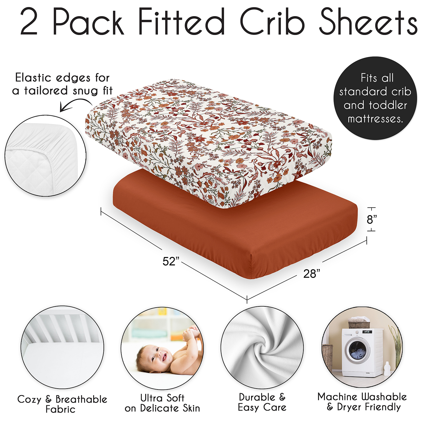 SNUG FIT: Includes: (2) Baby Crib Sheets: 52in. x 28in. x 8in. Our newborn standard crib sheets fit snugly, with premium elastic sewn around the entire bottom edge for a secure fit on most standard sized cribs and toddler beds, to reduce shifting and bunching. This botanical microfiber cribsheets set features an exclusive design of a solid rust paired with an orange, green, maroon, pink, burgundy & off white paisley, leaves, leaf, daisy flower print and is gentle on delicate skin.DESIGNED IN THE USA: By real parents who understand the need for comfort, practicality, and style. Sweet Jojo Designs is a small, women owned business. The mom's on our team know a crib mattress sheet is first priority for your baby essentials to ensure a restful night of sleep. We use top fabrics and designs to create soft crib sheets that are stretchy and comfortable for your infant or toddler. We've studied the latest trends in floral crib sheets for baby girl to bring you the finest product.SAFE & DURABLE: Sweet Jojo Designs is a proud Baby Safety Alliance member and rigorously tests products to meet or exceed CPSC safety standards. Our breathable crib sheets are designed with busy parents in mind. Quick to change, easy machine washable and tumble dry on low. The high quality stitching and fabric ensure long-lasting use and will hold up wash after wash. Use one crib sheet in your newborns bed and have spares nearby to swap in between washes & to be prepared if an accident happens.PERFECT GIFT: Add baby girl crib sheets to your list of must haves! Including a baby fitted crib sheet on your gift registry, in a baby shower gift basket or as a gender reveal present is an easy way to prepare for a baby's arrival. Whether it's nap time, bedtime, or an unexpected mess, having extras of these baby mattress sheets make changes effortless so you can focus on what matters most to you and your family. And remember, you can never have too many baby crib sheets or toddler bed sheets!NURSERY DESIGN MADE EASY: If you have a nursery to decorate, we have endless coordinating options to help. A nursery theme can be planned entirely around baby sheets for crib. Sweet Jojo Designs makes decorating simple with matching crib bedding sets, toddler bedding sets, crib sheet set, crib bed sheets, changing pad covers, milestone blankets, wall decor, decorative accessories, swaddles, and window treatments to make sure you have all you need to complete the look of your baby room. Item# 2P-CS-WildFlower-IV-OR-PRT