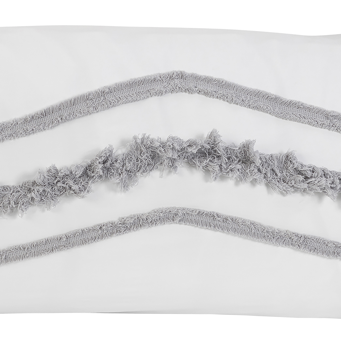 Design: Minimalist luxury White cotton with textured hand tufted Grey fringe trims in an oversized chevron pattern.Set and Dimensions: Set of 2 Decorative Pillow Covers, 18 in. x 18 in. each (does not come with pillow inserts)Materials and Care: 100% Cotton - extremely soft and breathable. Machine washable. Tumble dry low.Features: Hidden zipper closure on pillowcases makes inserting and removing your pillow quick and easy.Matching Accessories: We offer coordinating bedding sets, decorative throw pillows, shower curtains, window panels, pouf covers, bed skirts, body pillows and more. Please check our store for these accessories.Item# 2P-Dec18-Tuft-WH-GY