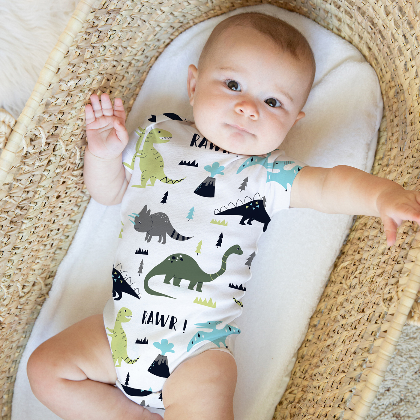 Includes: (1) Short Sleeve bodysuit and (1) Long Sleeve bodysuit made to fit 0-6 months. See Size Chart in Images for specifications.Materials: 95% Rayon / 5% Spandex Jersey Stretch Knit fabric. Easy machine washable, tumble dry lowThis short and long sleeve infant clothes features an exclusive design of green, turquoise, navy blue, grey and white modern dinosaur boho bohemian mod dino volcano prehistoric dinosaurs printThese baby one pieces are the best addition to your little one’s closet and will be your next newborn essential. Thoughtfully designed with comfort in mind with soft fabrics to be gentle on baby’s delicate skin, they are also made with a snap button closure and expandable overlap shoulder neckline for easy changing of diapers and baby clothing. Interchange the long sleeve bodysuit with the short sleeve bodysuit to be ready for both the cool and warm seasons. Use these infant bodysuits for causal wear, baby photo shoots, family photoshoots and celebrations or pair with baby joggers, pants, shorts, jumpers or leggings to create a picture for sharing on social media walls, stories and feeds for friends and family. Makes the perfect gift to coordinate with Sweet Jojo Designs nursery bedding, crib sheets, crib skirts, changing pad covers, and home decor accessories. Include this romper set in your baby shower gift basket, hospital take home bundle, gender reveal presents or add to your baby gift registry to ensure you have all you need to complete your Sweet Jojo Designs baby bed room look.Item# 2p-One-0-6-ModDino-BU-GR
