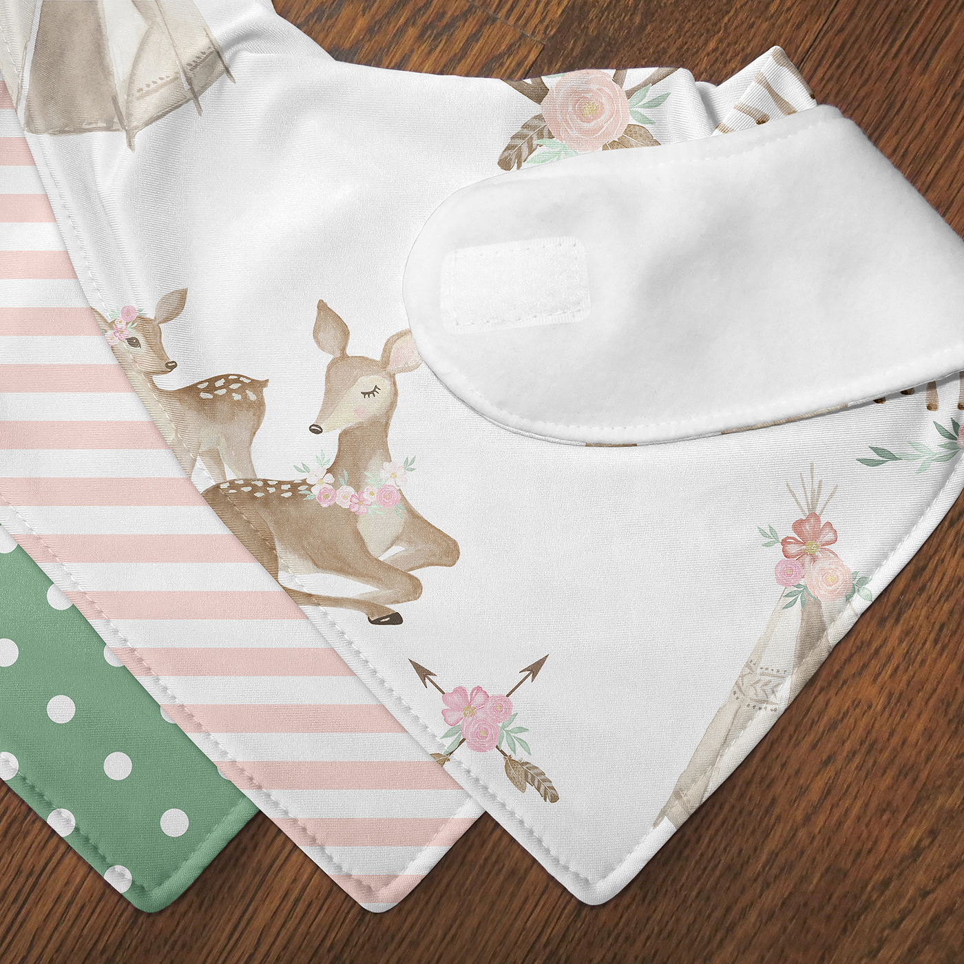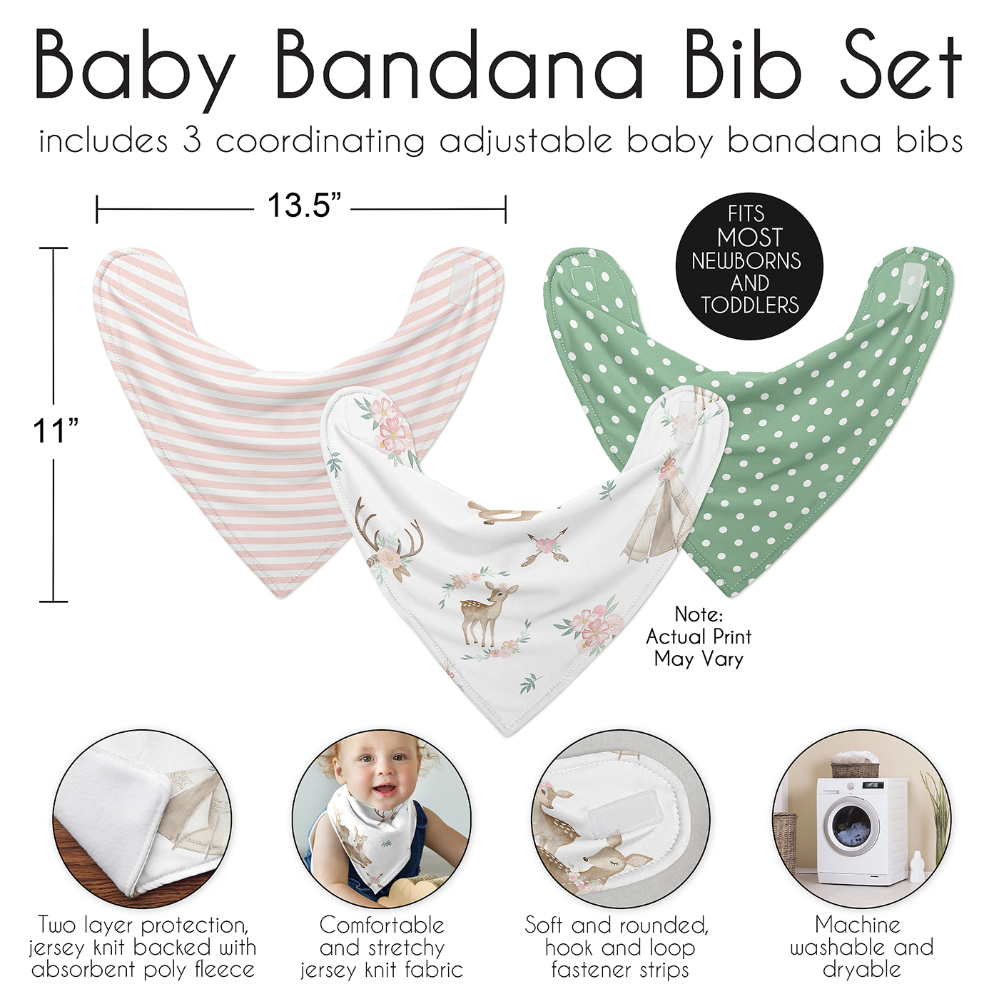 Makes the perfect gift to coordinate with Sweet Jojo Designs nursery bedding, crib sheets, changing pad covers, nursing pillow covers, room decor and accessoriesItem# 3P-Bib-DeerFloral-PRT