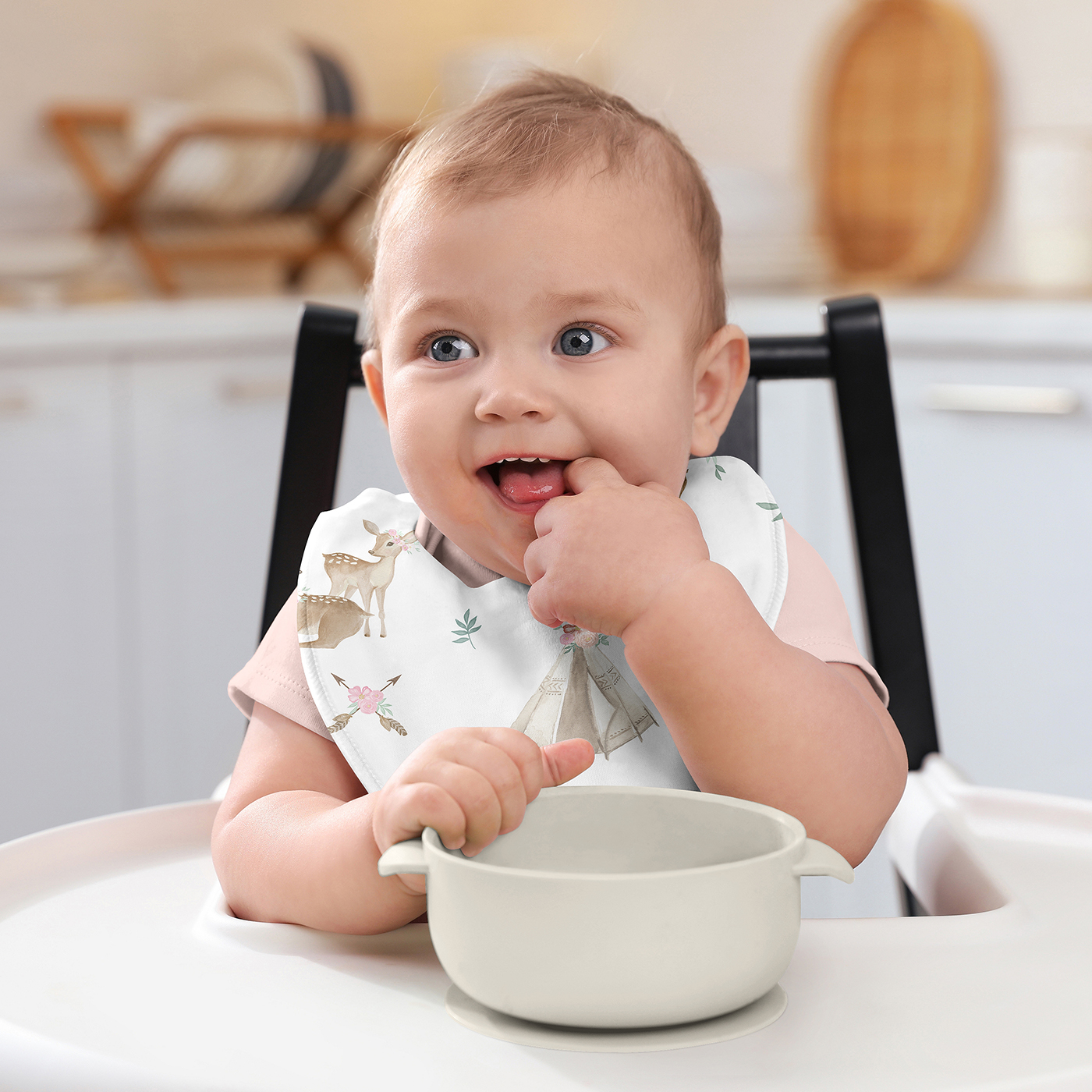 Soft fabric infant bibs are made to be absorbent during meal times and are adjustable with a hook and loop closure. Please note: for safe use, bib should be removed while child is sleeping or unsupervised.