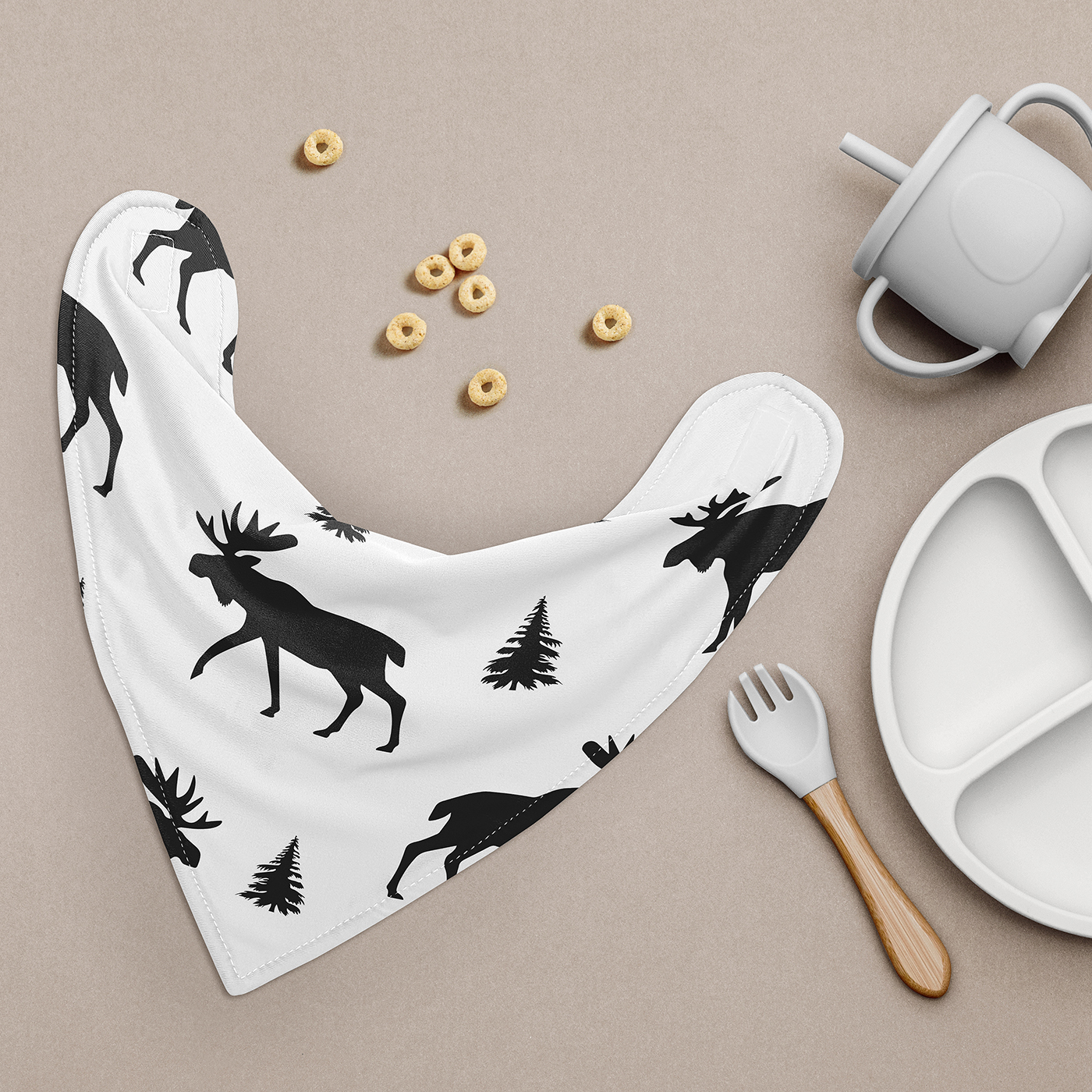 95% Rayon/5% Spandex Jersey Stretch Knit lined with polyester fleece backing featuring exclusive coordinating fabrics of black and white woodland forest moose and trees and black and white stripes