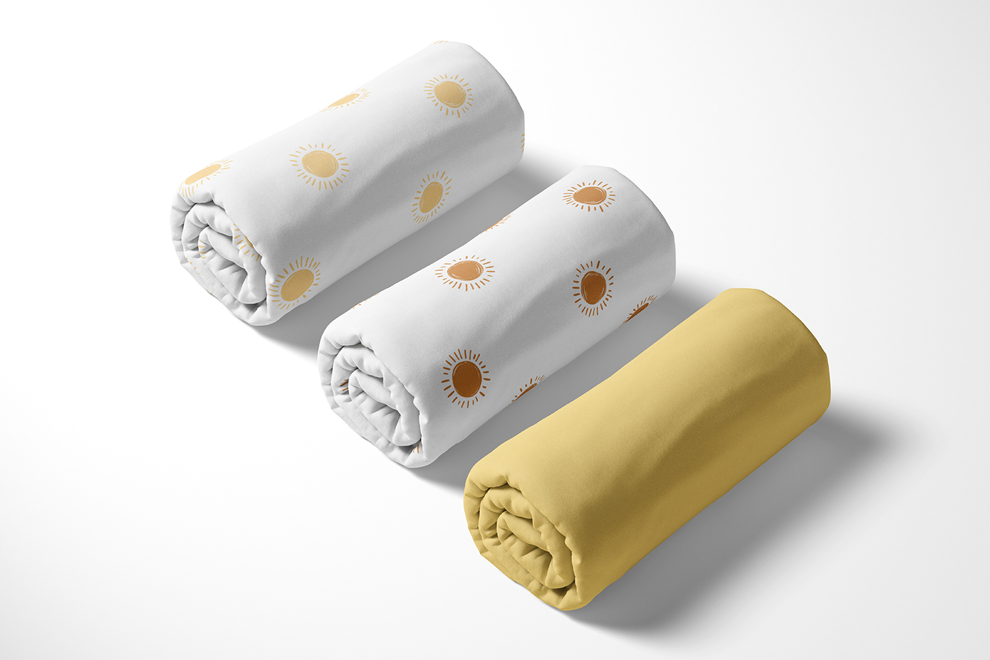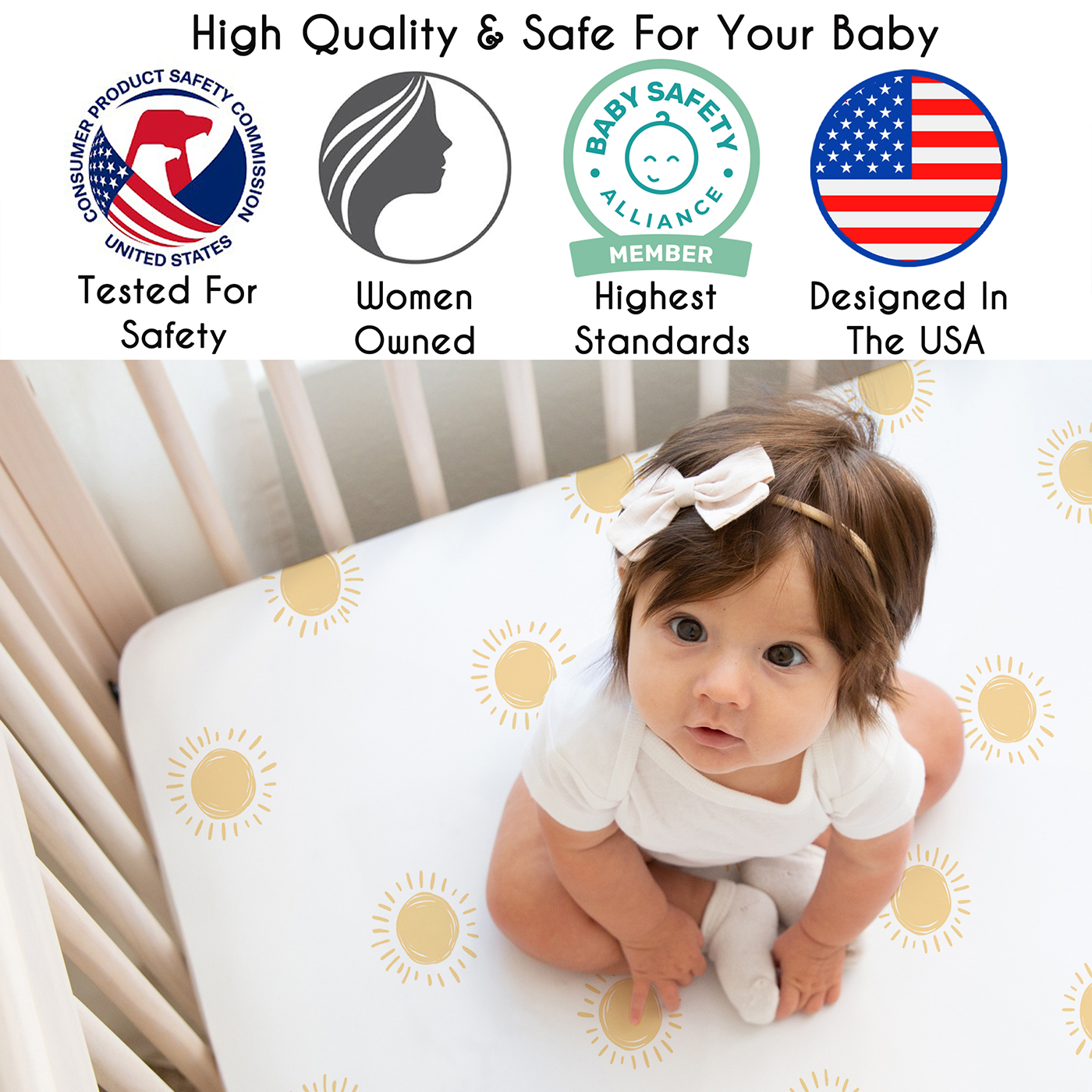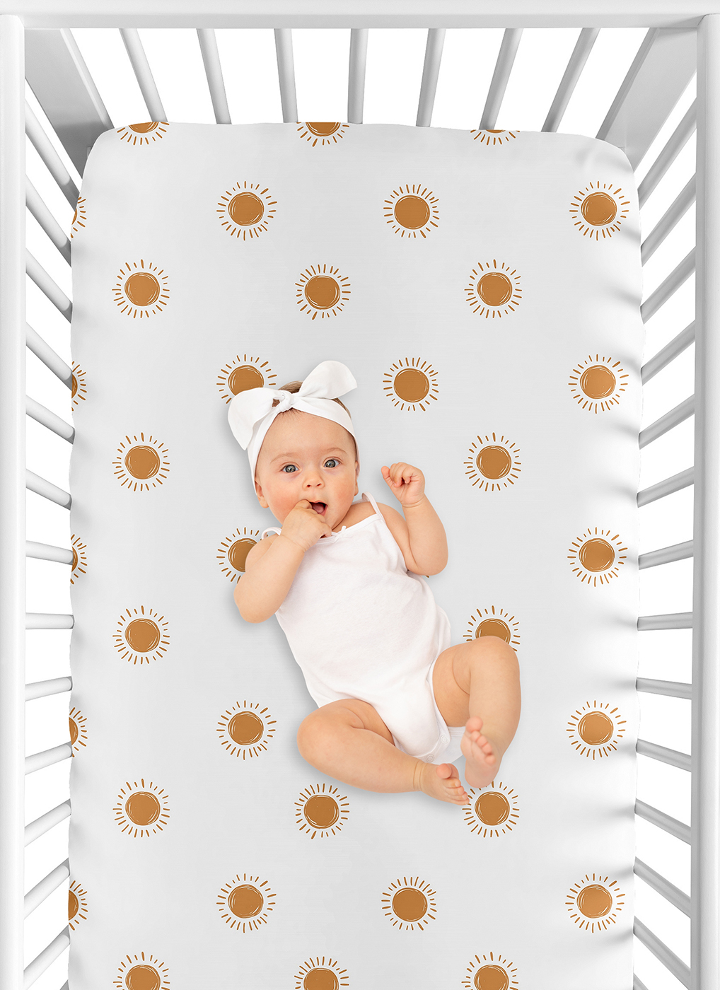 SNUG FIT: Includes: (3) Baby Crib Sheets: 52in. x 28in. x 8in. each. Our newborn standard crib sheets fit snugly, with premium elastic sewn around the entire bottom edge for a secure fit on most standard sized cribs and toddler beds, to reduce shifting and bunching. This nature microfiber cribsheets set features an exclusive design of a solid mustard, a white & orange sky suns print & a yellow and white outdoors sunshine print & is gentle on delicate skin to foster a soothing sleep environment.DESIGNED IN THE USA: By real parents who understand the need for comfort, practicality, and style. Sweet Jojo Designs is a small, women owned business. The mom's on our team know a crib mattress sheet is first priority for your baby essentials to ensure a restful night of sleep. We use top fabrics & designs to create soft crib sheets that are stretchy & comfortable for your infant or toddler. We've studied the latest trends in sun crib sheets for baby boys/girls to bring you the finest product.SAFE & DURABLE: Sweet Jojo Designs is a proud Baby Safety Alliance member and rigorously tests products to meet or exceed CPSC safety standards. Our breathable crib sheets are designed with busy parents in mind. Quick to change, easy machine washable and tumble dry on low. The high quality stitching and fabric ensure long-lasting use and will hold up wash after wash. Use one crib sheet in your newborns bed and have spares nearby to swap in between washes & to be prepared if an accident happens.PERFECT GIFT: Add baby unisex crib sheets to your list of must haves! Including a baby fitted crib sheet on your gift registry, in a baby shower gift basket or as a gender reveal present is an easy way to prepare for a baby's arrival. Whether it's nap time, bedtime, or an unexpected mess, having extras of these baby mattress sheets make changes effortless so you can focus on what matters most to you & your family. And remember, you can never have too many baby crib sheets or toddler bed sheets!NURSERY DESIGN MADE EASY: If you have a nursery to decorate, we have endless coordinating options to help. A nursery theme can be planned entirely around baby sheets for crib. Sweet Jojo Designs makes decorating simple with matching crib bedding sets, toddler bedding sets, crib sheet set, crib bed sheets, changing pad covers, milestone blankets, wall decor, decorative accessories, swaddles, and window treatments to make sure you have all you need to complete the look of your baby room. Item# 3P-CS-Sun-WH-MU