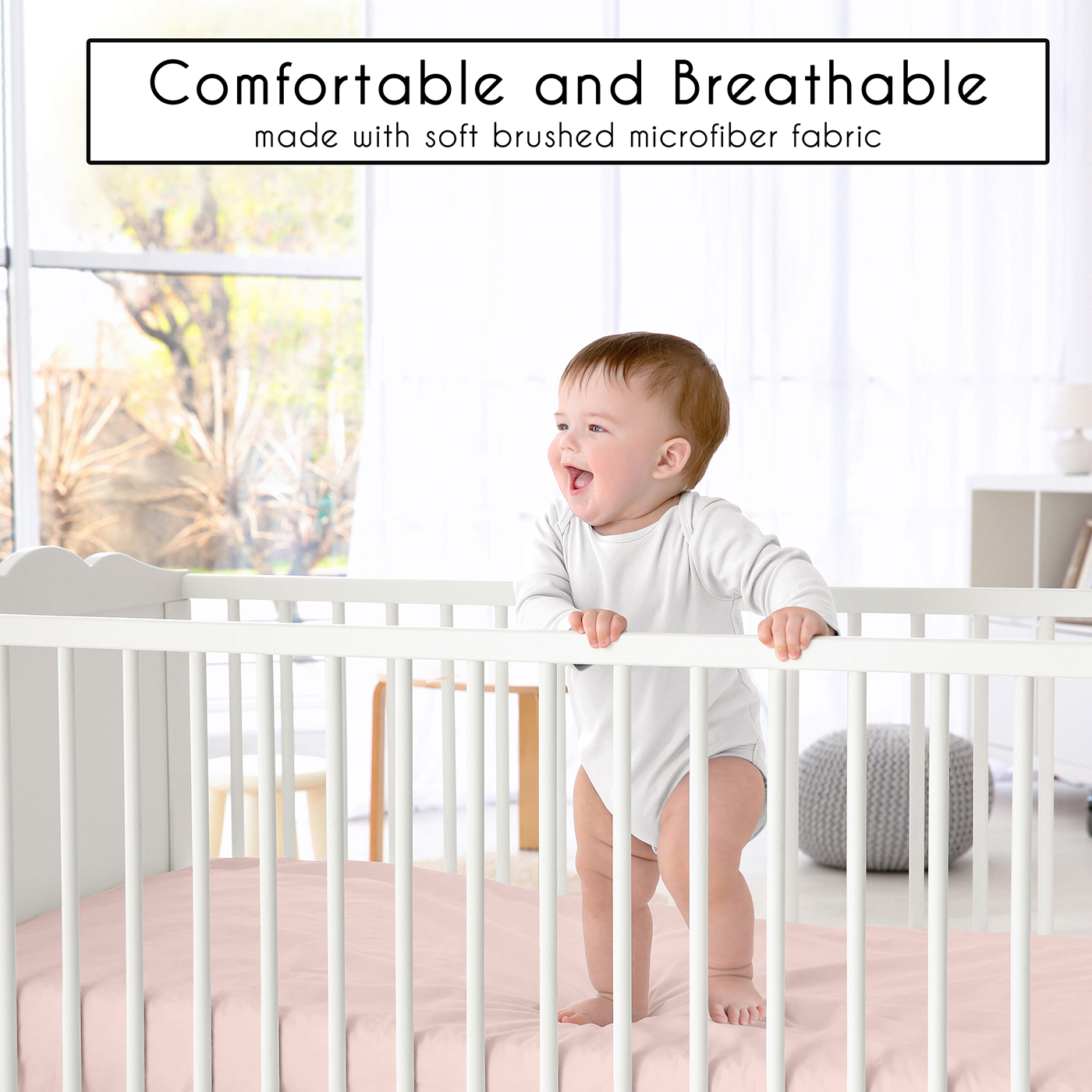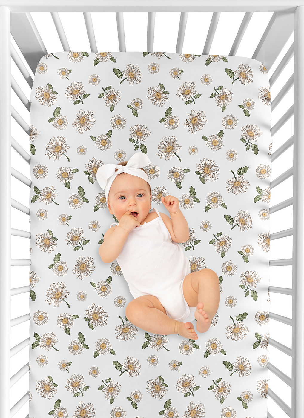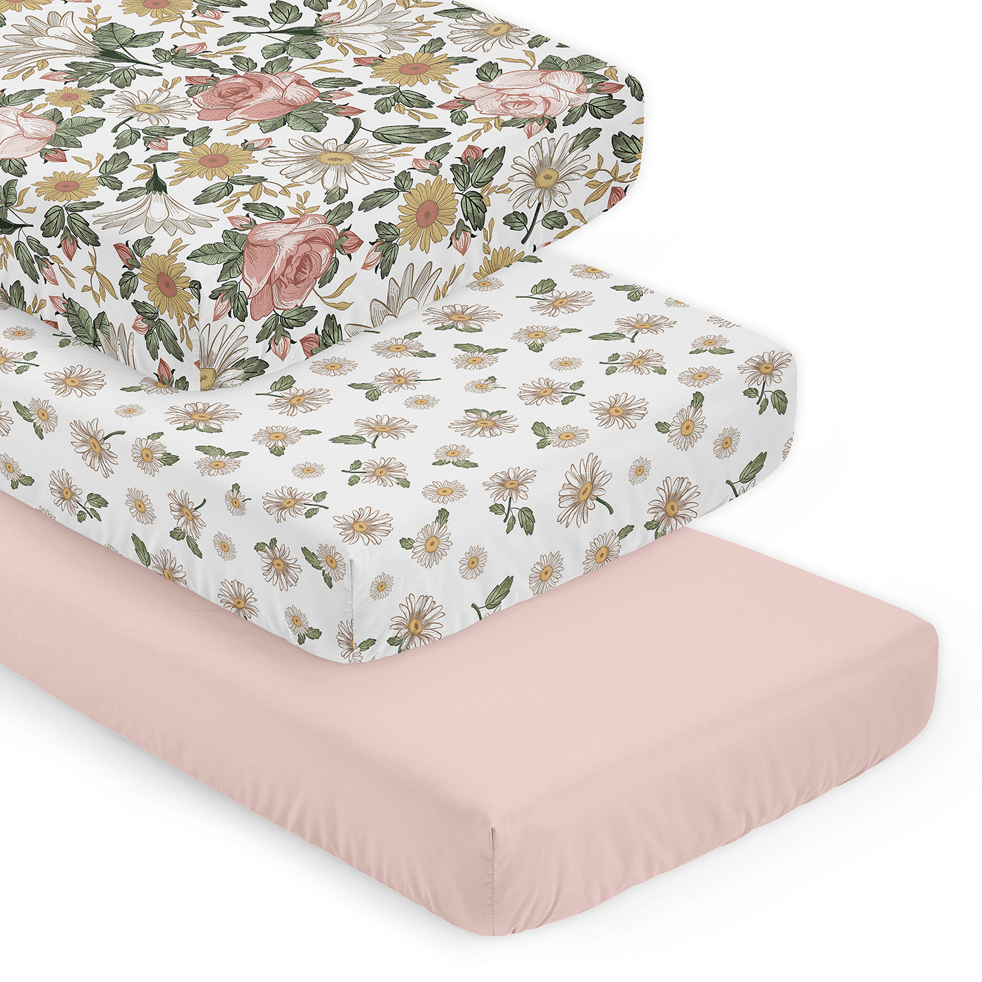SNUG FIT: Includes: (3) Baby Crib Sheets: 52in. x 28in. x 8in. each. Our newborn standard crib sheets fit snugly, with premium elastic sewn around the entire bottom edge for a secure fit on most standard sized cribs and toddler beds, to reduce shifting and bunching. This elegant microfiber cribsheets set features an exclusive design of a solid pink, a daisies rose print & a sage green, blush & yellow wildflower leaf print and is gentle on delicate skin to foster a soothing sleep environment.DESIGNED IN THE USA: By real parents who understand the need for comfort, practicality, and style. Sweet Jojo Designs is a small, women owned business. The mom's on our team know a crib mattress sheet is first priority for your baby essentials to ensure a restful night of sleep. We use top fabrics and designs to create soft crib sheets that are stretchy & comfortable for your infant or toddler. We've studied the latest trends in floral crib sheets for baby girls to bring you the finest product.SAFE & DURABLE: Sweet Jojo Designs is a proud Baby Safety Alliance member and rigorously tests products to meet or exceed CPSC safety standards. Our breathable crib sheets are designed with busy parents in mind. Quick to change, easy machine washable and tumble dry on low. The high quality stitching and fabric ensure long-lasting use and will hold up wash after wash. Use one crib sheet in your newborns bed and have spares nearby to swap in between washes & to be prepared if an accident happens.PERFECT GIFT: Add baby girl crib sheets to your list of must haves! Including a baby fitted crib sheet on your gift registry, in a baby shower gift basket or as a gender reveal present is an easy way to prepare for a baby's arrival. Whether it's nap time, bedtime, or an unexpected mess, having extras of these baby mattress sheets make changes effortless so you can focus on what matters most to you and your family. And remember, you can never have too many baby crib sheets or toddler bed sheets!NURSERY DESIGN MADE EASY: If you have a nursery to decorate, we have endless coordinating options to help. A nursery theme can be planned entirely around baby sheets for crib. Sweet Jojo Designs makes decorating simple with matching crib bedding sets, toddler bedding sets, crib sheet set, crib bed sheets, changing pad covers, milestone blankets, wall decor, decorative accessories, swaddles, and window treatments to make sure you have all you need to complete the look of your baby room. Item# 3P-CS-VintageFloral-PK-GR
