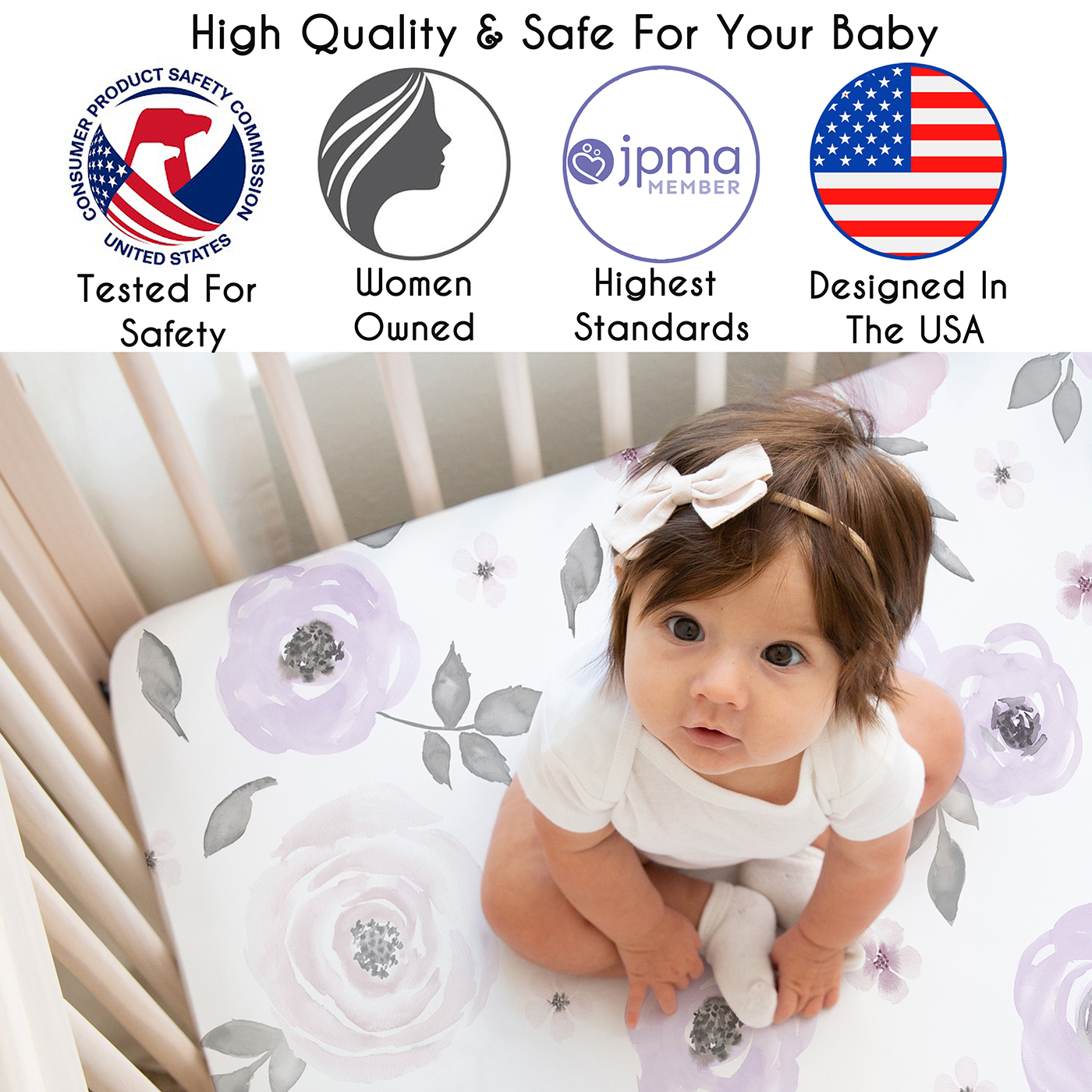 SNUG FIT: Includes: (3) Baby Crib Sheets: 52in. x 28in. x 8in. each. Our newborn standard crib sheets fit snugly, with premium elastic sewn around the entire bottom edge for a secure fit on most standard sized cribs and toddler beds, to reduce shifting & bunching. This farmhouse microfiber cribsheets set features an exclusive design of a white & grey polka dot, solid purple & a watercolor violet, gray & blush pink flower print & is gentle on delicate skin to foster a soothing sleep environment.DESIGNED IN THE USA: By real parents who understand the need for comfort, practicality, and style. Sweet Jojo Designs is a small, women owned business. The mom's on our team know a crib mattress sheet is first priority for your baby essentials to ensure a restful night of sleep. We use top fabrics and designs to create soft crib sheets that are stretchy & comfortable for your infant or toddler. We've studied the latest trends in floral crib sheets for baby girls to bring you the finest product.SAFE & DURABLE: Sweet Jojo Designs is a proud Baby Safety Alliance member and rigorously tests products to meet or exceed CPSC safety standards. Our breathable crib sheets are designed with busy parents in mind. Quick to change, easy machine washable and tumble dry on low. The high quality stitching and fabric ensure long-lasting use and will hold up wash after wash. Use one crib sheet in your newborns bed and have spares nearby to swap in between washes & to be prepared if an accident happens.PERFECT GIFT: Add baby girl crib sheets to your list of must haves! Including a baby fitted crib sheet on your gift registry, in a baby shower gift basket or as a gender reveal present is an easy way to prepare for a baby's arrival. Whether it's nap time, bedtime, or an unexpected mess, having extras of these baby mattress sheets make changes effortless so you can focus on what matters most to you and your family. And remember, you can never have too many baby crib sheets or toddler bed sheets!NURSERY DESIGN MADE EASY: If you have a nursery to decorate, we have endless coordinating options to help. A nursery theme can be planned entirely around baby sheets for crib. Sweet Jojo Designs makes decorating simple with matching crib bedding sets, toddler bedding sets, crib sheet set, crib bed sheets, changing pad covers, milestone blankets, wall decor, decorative accessories, swaddles, and window treatments to make sure you have all you need to complete the look of your baby room. Item# 3P-CS-WatercolorFloral-LV-GY