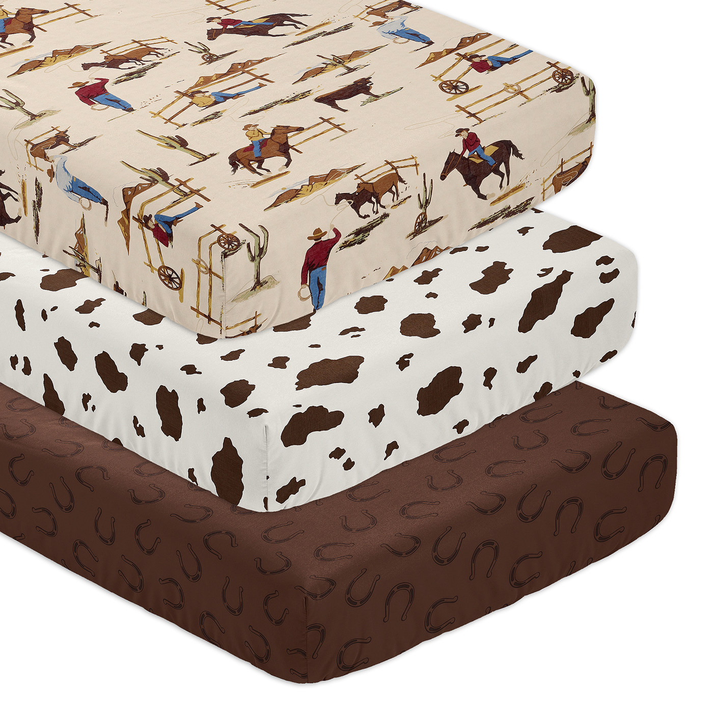 Includes: (3) Fitted Crib Sheets: 52in. x 28in. x 8in. Easy machine washable, tumble dry low. Use the fully elastic bottom for a secure fit on most standard size cribs and toddler beds.Your 3 pack crib sheet set includes: (1) brushed microfiber crib sheets featuring an exclusive design of a vintage inspired southwestern cowboy print complete with horses, cattle and cacti in a desert sunset landscape print and (1) brushed microfiber crib sheet featuring an off white cream and chocolate brown animal cow print and (1) brushed microfiber crib sheet featuring a tonal horseshoe print, all designed to coordinate with the Wild West Cowboy Collection.Add a pack of 3 baby crib sheets to your list of must haves for your new bundle of joy! This soft crib sheet is the perfect combination of stretchy and comfortable fabric to give your infant or toddler the perfect nights’ sleep. Use the 3 piece crib sheet set to make sure you are never without a sheet. Keep standard crib sheets readily on hand so you can grab a sheet in between washes or be prepared if an accident happens in the crib!Guarantee a good night’s rest for your newborn with a pack of baby crib sheets. Makes the perfect gift to coordinate with Sweet Jojo Designs nursery bedding, changing pad covers, nursing pillow covers, nursery room decoration accessories and layette sets. Include It in your baby shower gift basket or gender reveal presents or add to your baby gift registry to ensure you have all you need to complete your Sweet Jojo Designs baby bed room look.Item# 3P-CS-WildWest-HS