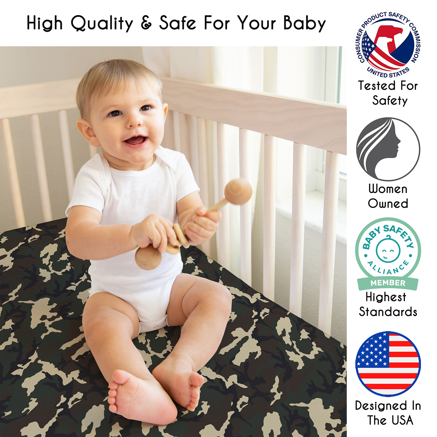 SNUG FIT: Includes: (3) Baby Crib Sheets: 52in. x 28in. x 8in. each. Our newborn standard crib sheets fit snugly, with premium elastic sewn around the entire bottom edge for a secure fit on most standard sized cribs & toddler beds, to reduce shifting & bunching. This forest microfiber cribsheets set features an exclusive design of a solid dark green, a white & black stag animal antler print & a military, army, camouflage print & is gentle on delicate skin to foster a soothing sleep environment.DESIGNED IN THE USA: By real parents who understand the need for comfort, practicality, and style. Sweet Jojo Designs is a small, women owned business. The mom's on our team know a crib mattress sheet is first priority for your baby essentials to ensure a restful night of sleep. We use top fabrics and designs to create soft crib sheets that are stretchy & comfortable for your infant or toddler. We've studied the latest trends in woodland crib sheets for baby boys to bring you the finest product.SAFE & DURABLE: Sweet Jojo Designs is a proud Baby Safety Alliance member and rigorously tests products to meet or exceed CPSC safety standards. Our breathable crib sheets are designed with busy parents in mind. Quick to change, easy machine washable and tumble dry on low. The high quality stitching and fabric ensure long-lasting use and will hold up wash after wash. Use one crib sheet in your newborns bed and have spares nearby to swap in between washes & to be prepared if an accident happens.PERFECT GIFT: Add baby boy crib sheets to your list of must haves! Including a baby fitted crib sheet on your gift registry, in a baby shower gift basket or as a gender reveal present is an easy way to prepare for a baby's arrival. Whether it's nap time, bedtime, or an unexpected mess, having extras of these baby mattress sheets make changes effortless so you can focus on what matters most to you and your family. And remember, you can never have too many baby crib sheets or toddler bed sheets!NURSERY DESIGN MADE EASY: If you have a nursery to decorate, we have endless coordinating options to help. A nursery theme can be planned entirely around baby sheets for crib. Sweet Jojo Designs makes decorating simple with matching crib bedding sets, toddler bedding sets, crib sheet set, crib bed sheets, changing pad covers, milestone blankets, wall decor, decorative accessories, swaddles, and window treatments to make sure you have all you need to complete the look of your baby room. Item# 3P-CS-WoodlandCamo