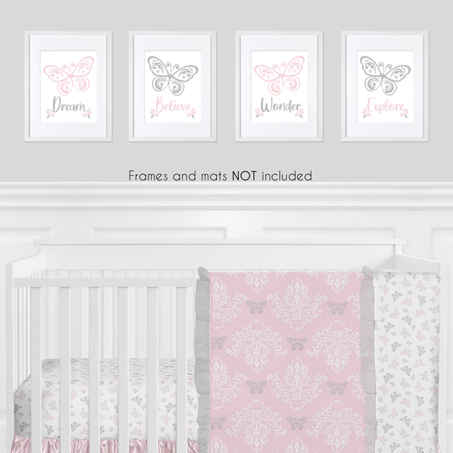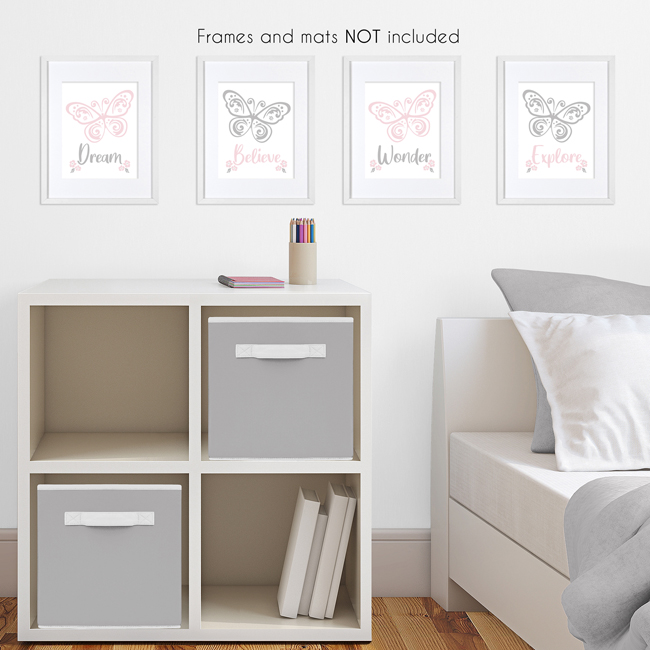 • Decorative wall art print set features butterflies and flowers with inspirational "Dream", "Believe", "Explore" and "Wonder" quotes.