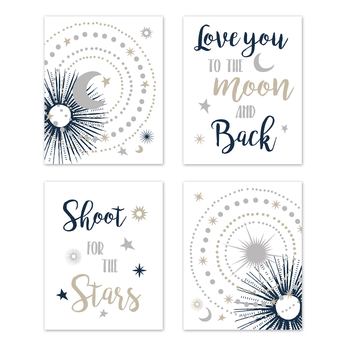Decorative wall art print set features stars and moons with inspirational "Love You To The Moon and Back" and "Shoot For The Stars" quotes.Item# 4P-Prints-Celestial-BU