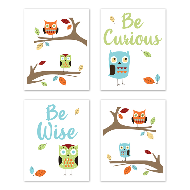 Hooty Turquoise and Lime Collection Wall Art Prints - Set of 4