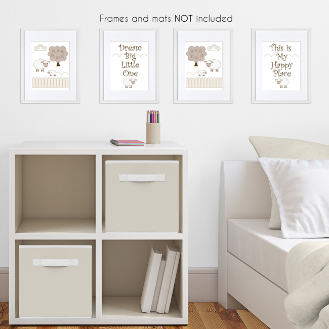 • Decorative wall art print set features lambs and trees with inspirational "Dream Big Little One" and "This Is My Happy Place" quotes.