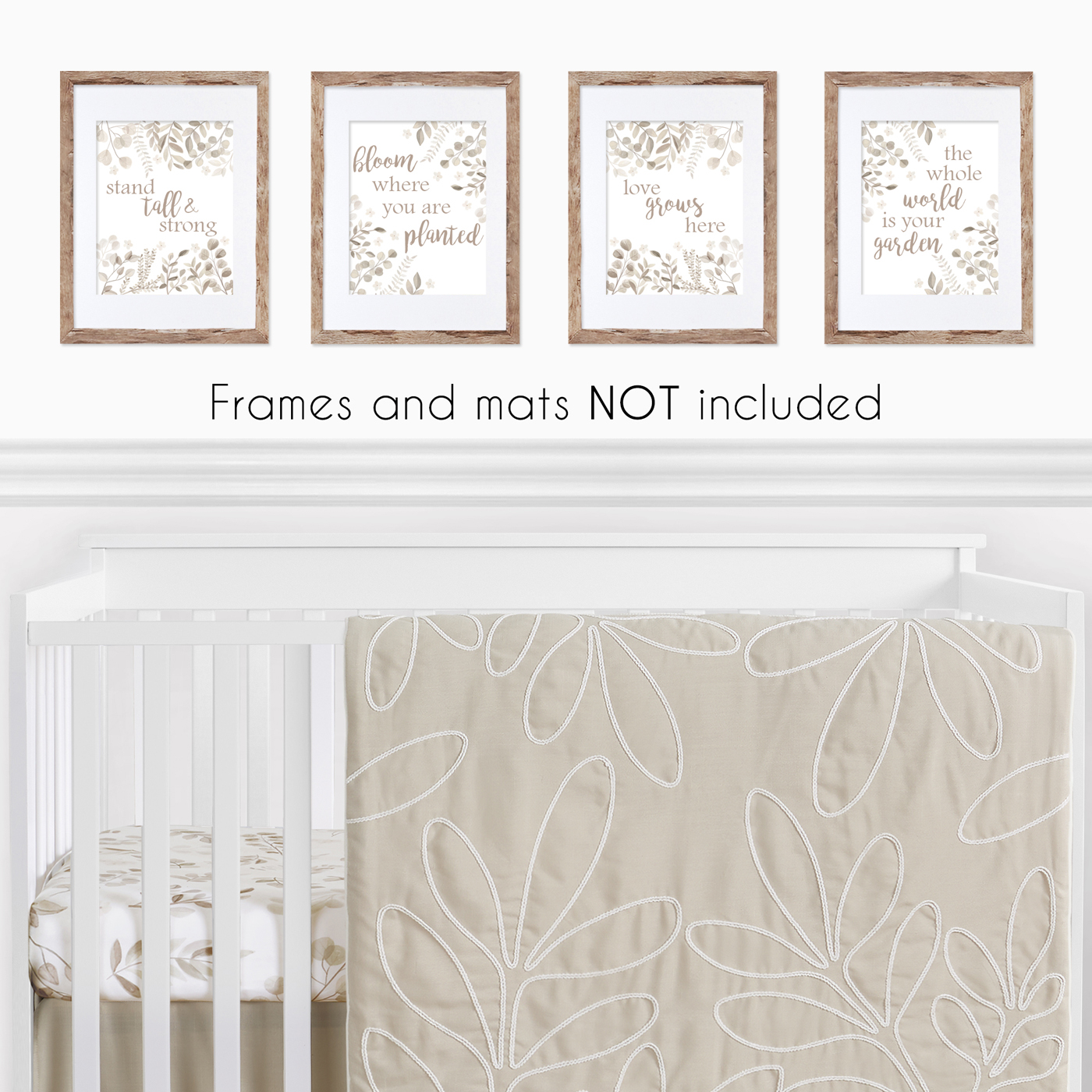 • Decorative wall art print set features watercolor botanical leaves with inspirational "Stand Tall & Strong", "Bloom Where You Are Planted", "The Whole World Is Your Garden" and "Love Grows Here" quotes.