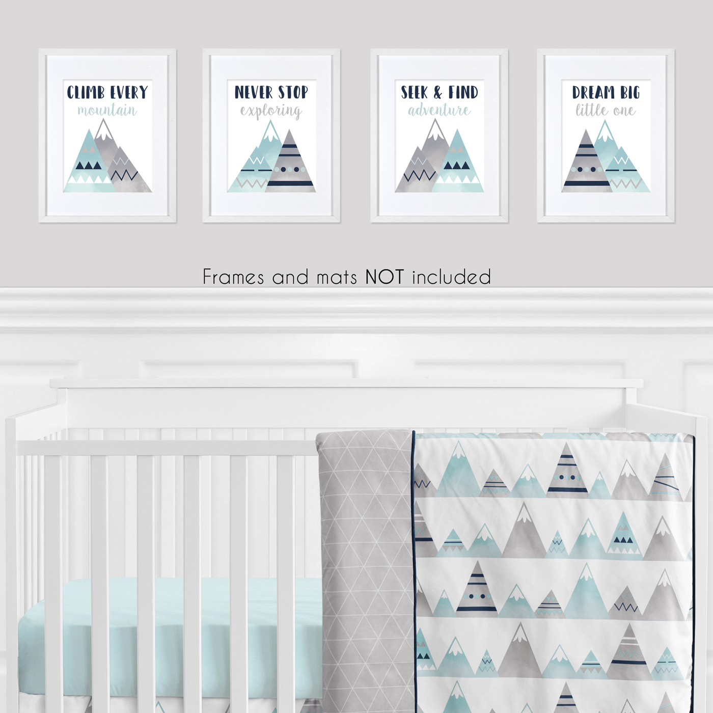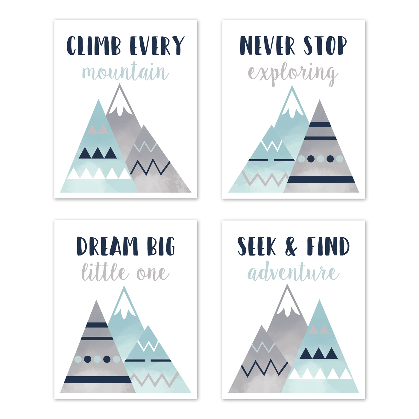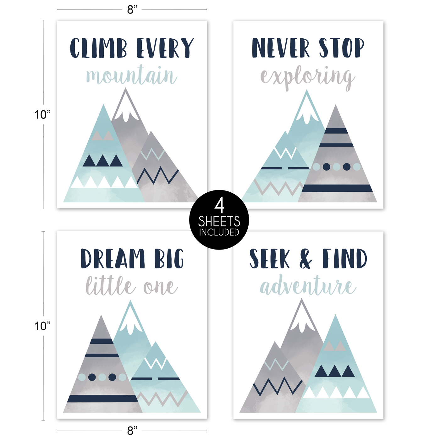 • Decorative wall art print set features mountains with inspirational "Climb Every Mountain", "Never Stop Exploring", "Dream Big Little One" and "Seek & Find Adventure" quotes.