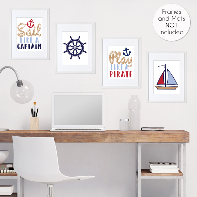 • Decorative wall art print set features a sailboat, captains wheel, and anchors with inspirational "Sail Like A Captain" and "Play Like A Pirate" quotes.