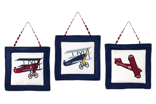 Vintage Aviator 11 pc Crib Bedding set has all that your little bundle of joy will need. Let the little one in your home settle down to sleep in this incredible nursery set. This charming baby boy crib bedding set uses navy and sky blue borders with a red and white stripe piping and delicate quilt stitching lines that add detail and style. Flying throughout the set are wonderful, detailed embroidery and appliqué works of vintage airplanes. This collection uses the stylish colors of Navy, Sky Blue, Red and White. The design uses 100% cotton fabrics combined with microsuede fabrics that are machine washable for easy care. This wonderful set will fit most standard cribs and toddler beds.
