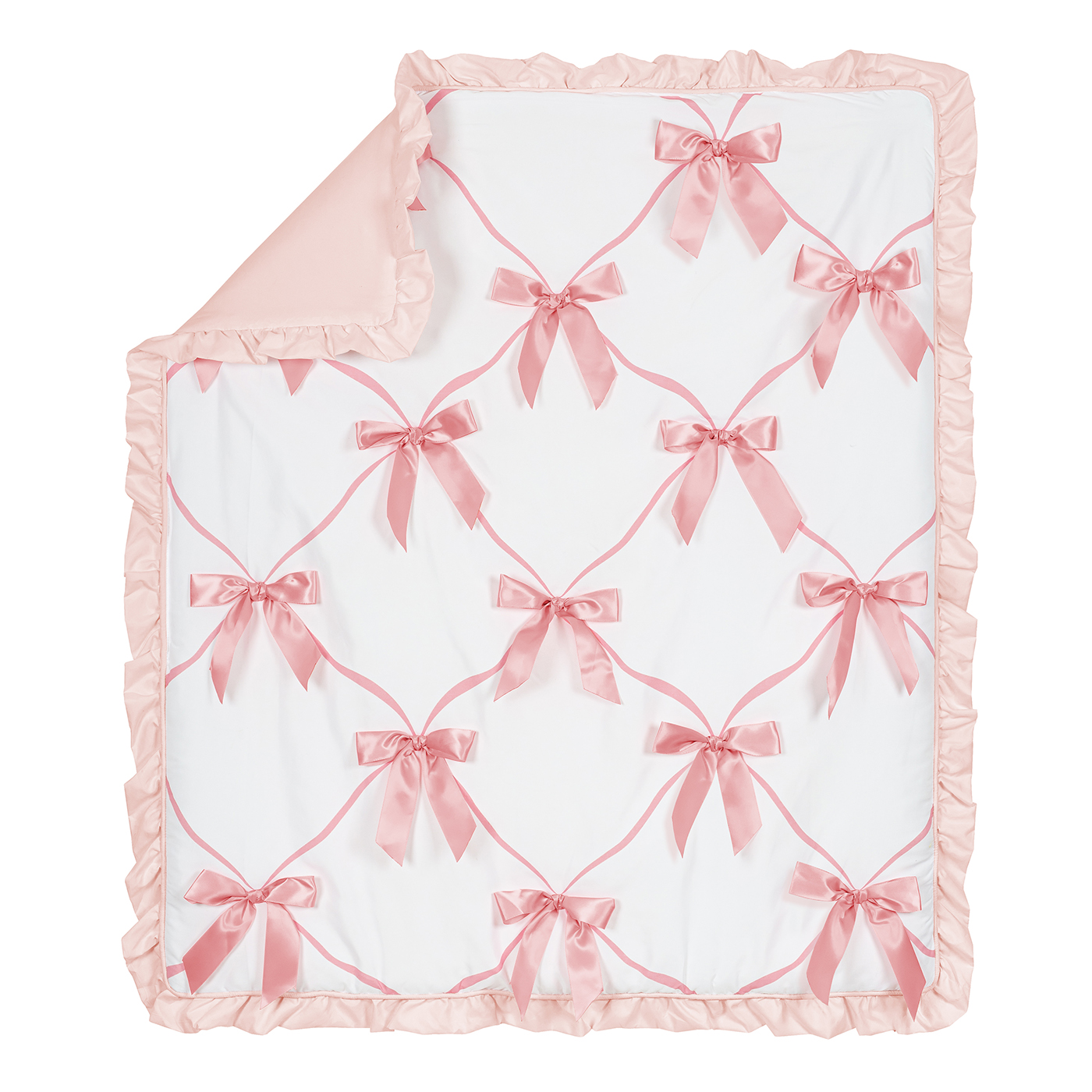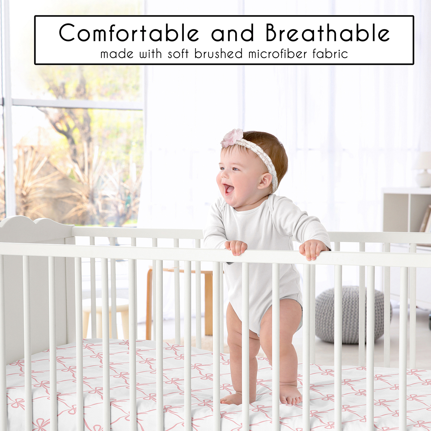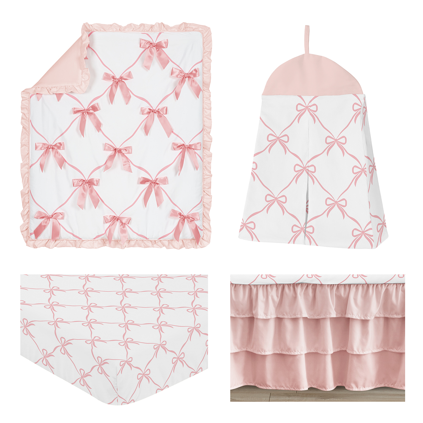 4 PIECE CRIB BEDDING SET INCLUDES: Crib Comforter (45in. x 36in.), Fitted Crib Sheet (52in. x 28in. x 8in. Pocket), Crib Skirt (52in. x 28in. x 15in. Drop) and Diaper stacker (15in. x 20in. x 6in.). An infant crib set including all the baby essentials is a great value compared to purchasing pieces separately. This baby crib set is made of soft microfiber fabric & satin ribbon & features a classic ballet color palette of rose blush pink & white to bring your princess themed baby room together.RIBBON AND BOWS THEME: This baby girl crib bedding set boasts an elegant crib blanket featuring ruffles around the edge and a coquette style ribbon print embellished with delicately tied satin bows that reverses to pink. The solid blush skirt features 3 ruffle tiered detailing. The pink bow breathable crib sheet has elastic sewn around the bottom edge for a secure fit on most standard cribs. The matching diaper stacker keeps nappies conveniently organized. Machine washable. Tumble dry low.DESIGNED IN USA TO BE SAFE & DURABLE: As a proud Baby Safety Alliance member who rigorously tests products to meet or exceed CPSC safety standards, Sweet Jojo Designs is dedicated to creating high-quality products that blends style, comfort, and functionality. Our products are crafted with premium materials to support your baby's sleep and well-being & help parents design the perfect space for their little one. Trusted by families worldwide, Sweet Jojo Designs brings your nursery vision to life.PERFECT GIFT: Add baby girl crib set to your list of must haves! Including a toddler crib bedding set on your gift registry, in a baby shower gift basket or as a gender reveal present is an easy way to prepare for a baby's arrival. A quilt provides unique decor or a cuddle time blankie and fitted crib sheets provide a soft surface to sleep on. Crib bed skirt dust ruffles add a polished touch and can hide storage under the crib. And a diaper stacker keeps diapers organized and accessible.NURSERY DESIGN MADE EASY: If you have a room to decorate, we have endless coordinating options to help. A nursery theme can be planned around baby bedding set, which creates a stylish cohesive room without having to mix and match pieces. Sweet Jojo Designs makes decorating simple with matching crib sheets, toddler bedding sets, crib sheet sets, changing pad covers, milestone blankets, wall decor, decorative accessories, window treatments and more to complete the look of your baby room. Item# Ballet-BOW-Crib-4