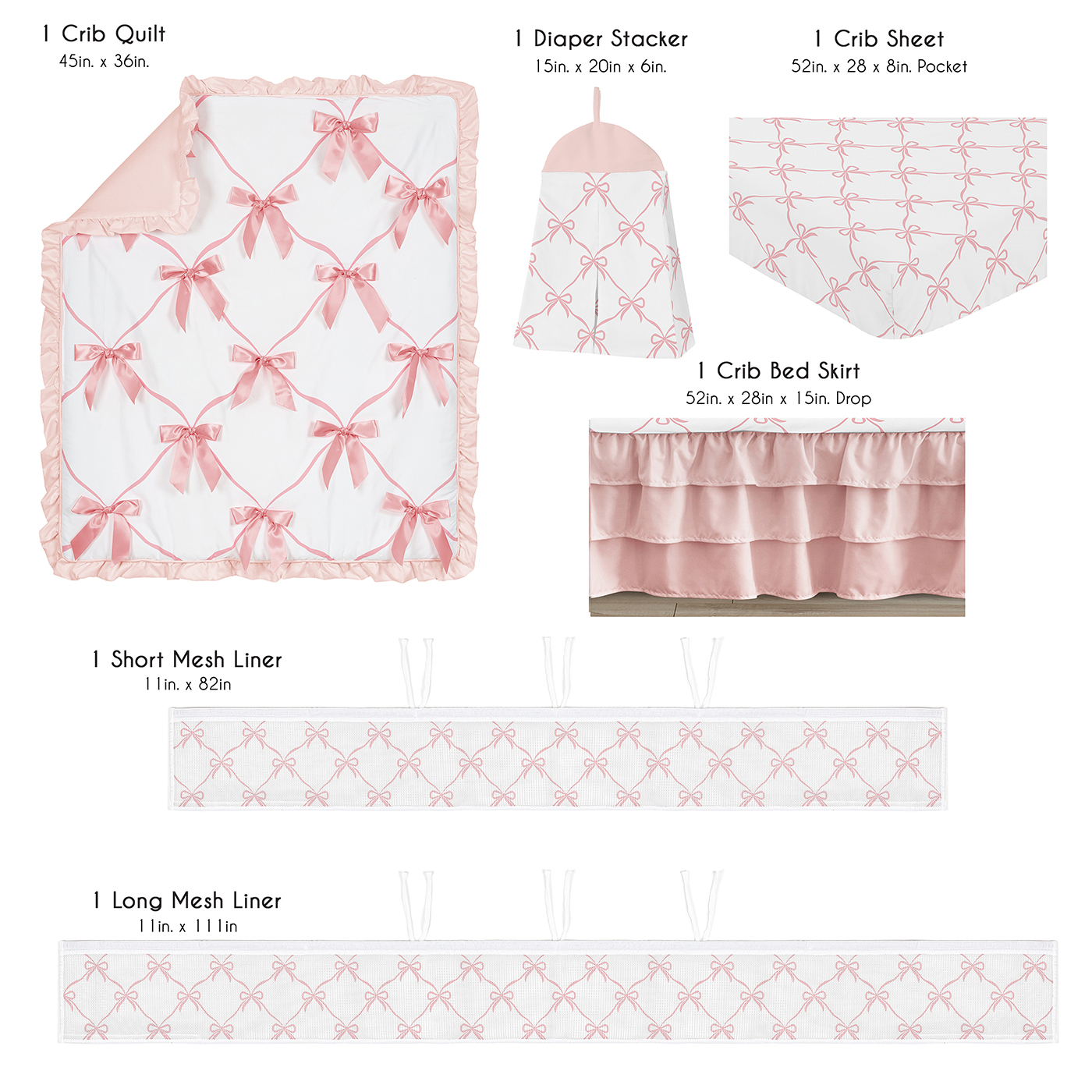6 PIECE CRIB BEDDING SET INCLUDES: Crib Comforter (45in. x 36in.), Fitted Crib Sheet (52in. x 28in. x 8in. Pocket), Long Panel Mesh Liner (11in. x 111in.), Short Panel Mesh Liner (11in. x 82in.), Crib Skirt (52in. x 28in. x 15in. Drop) & Diaper stacker (15in. x 20in. x 6in.). This baby crib set is made of 100% polyester microfiber fabrics. This infant crib set includes all your baby essentials and features the colors rose, blush pink and white to bring your elegant and girly baby room together.ELEGANT BOWS THEME: This baby girl crib bedding set boasts a crib blanket featuring a vintage themed style ribbons with satin bows tied into a knot where each diamond meets that reverses to a solid blush pink. The pink crib skirt is adorned with a 3 tiered gathered design. The classic bows print breathable crib sheet has elastic sewn around the bottom edge for a secure fit on most standard cribs. The matching diaper stacker keeps nappies conveniently organized. Machine washable. Tumble dry low.DESIGNED IN USA TO BE SAFE & DURABLE: As a proud Baby Safety Alliance member who rigorously tests products to meet or exceed CPSC safety standards, Sweet Jojo Designs is dedicated to creating high-quality products that blends style, comfort, and functionality. Our products are crafted with premium materials and details to support your baby's sleep and help parents design the perfect space for their little one. Trusted by families worldwide, Sweet Jojo Designs brings your nursery vision to life.PERFECT GIFT: Add baby girl crib set to your list of must haves! Including a toddler crib bedding set on your gift registry, in a baby shower gift basket or as a gender reveal present is an easy way to prepare for a baby's arrival. A quilt provides unique decor or a cuddle time blankie and fitted crib sheets provide a soft surface to sleep on. Crib bed skirt dust ruffles add a polished touch and can hide storage under the crib. And a diaper stacker keeps diapers organized and accessible.NURSERY DESIGN MADE EASY: If you have a room to decorate, we have endless coordinating options to help. A nursery theme can be planned around baby bedding set, which creates a stylish cohesive room without having to mix and match pieces. Sweet Jojo Designs makes decorating simple with matching crib sheets, toddler bedding sets, crib sheet sets, changing pad covers, milestone blankets, wall decor, decorative accessories, window treatments and more to complete the look of your baby room. Item# Ballet-BOW-Crib-6