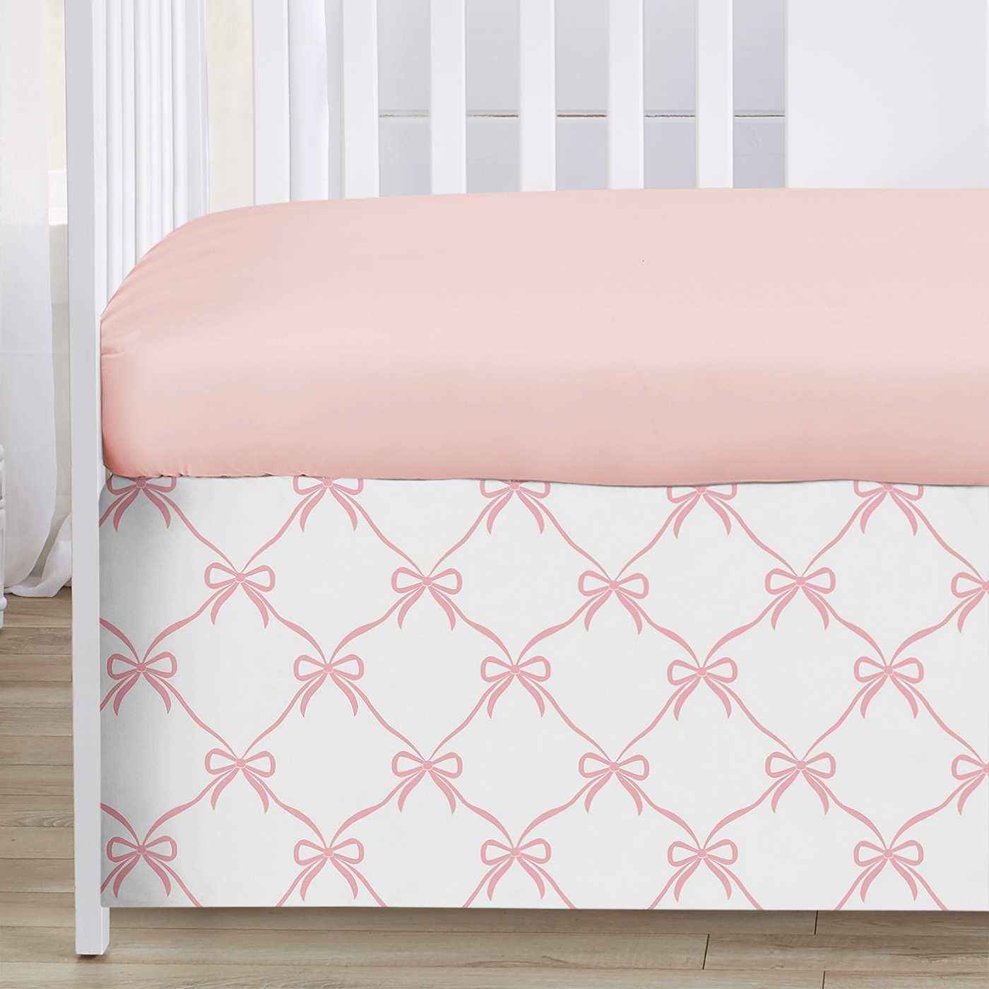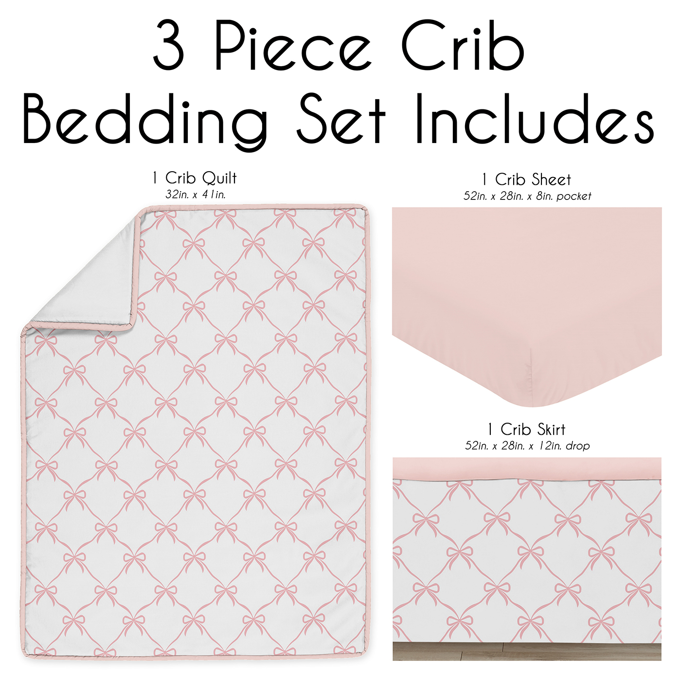 3 PIECE CRIB BEDDING SET INCLUDES: Crib Comforter (41in. x 32in.), Fitted Crib Sheet (52in. x 28in. x 8in. Pocket), and Crib Skirt (52in. x 28in. x 12in. Drop). An infant crib set including all the baby essentials is a great value compared to purchasing pieces separately. This shabby chic baby crib set is made of soft microfiber fabric and features a classic, delicate and feminine ballet color palette of rose blush pink and white to bring your ballerina princess dancer themed baby room together.BOWS THEME: This baby girl crib bedding set boasts an elegant crib blanket featuring a print of dainty ribbon style bows tied with a simple knot that reverses to an solid white. The straight skirt features split corners and is made with the same girly bow print as the comforter, designed to coordinate our floral ballet princess collection. The solid blush pink breathable crib sheet has elastic sewn around the bottom edge for a secure fit on most standard cribs. Machine washable. Tumble dry low.DESIGNED IN USA TO BE SAFE & DURABLE: As a proud JPMA member who rigorously tests products to meet or exceed CPSC safety standards, Sweet Jojo Designs is dedicated to creating high-quality products that blends style, comfort, and functionality. Our products are crafted with premium materials and details to support your baby's sleep and well-being and help parents design the perfect space for their little one. Trusted by families worldwide, Sweet Jojo Designs brings your nursery vision to life.PERFECT GIFT: Add baby girl crib set to your list of must haves! Including a toddler crib bedding set on your gift registry, in a baby shower gift basket or as a gender reveal present is an easy way to prepare for a baby's arrival. A quilt provides unique decor or a cuddle time blankie and fitted crib sheets provide a soft surface to sleep on. Crib bed skirt dust ruffles add a polished touch and can hide storage under the crib.NURSERY DESIGN MADE EASY: If you have a room to decorate, we have endless coordinating options to help. A nursery theme can be planned around baby bedding set, which creates a stylish cohesive room without having to mix and match pieces. Sweet Jojo Designs makes decorating simple with matching crib sheets, toddler bedding sets, crib sheet sets, changing pad covers, milestone blankets, wall decor, decorative accessories, window treatments and more to complete the look of your baby room. Item# Ballet-BOW-LC-Crib-3