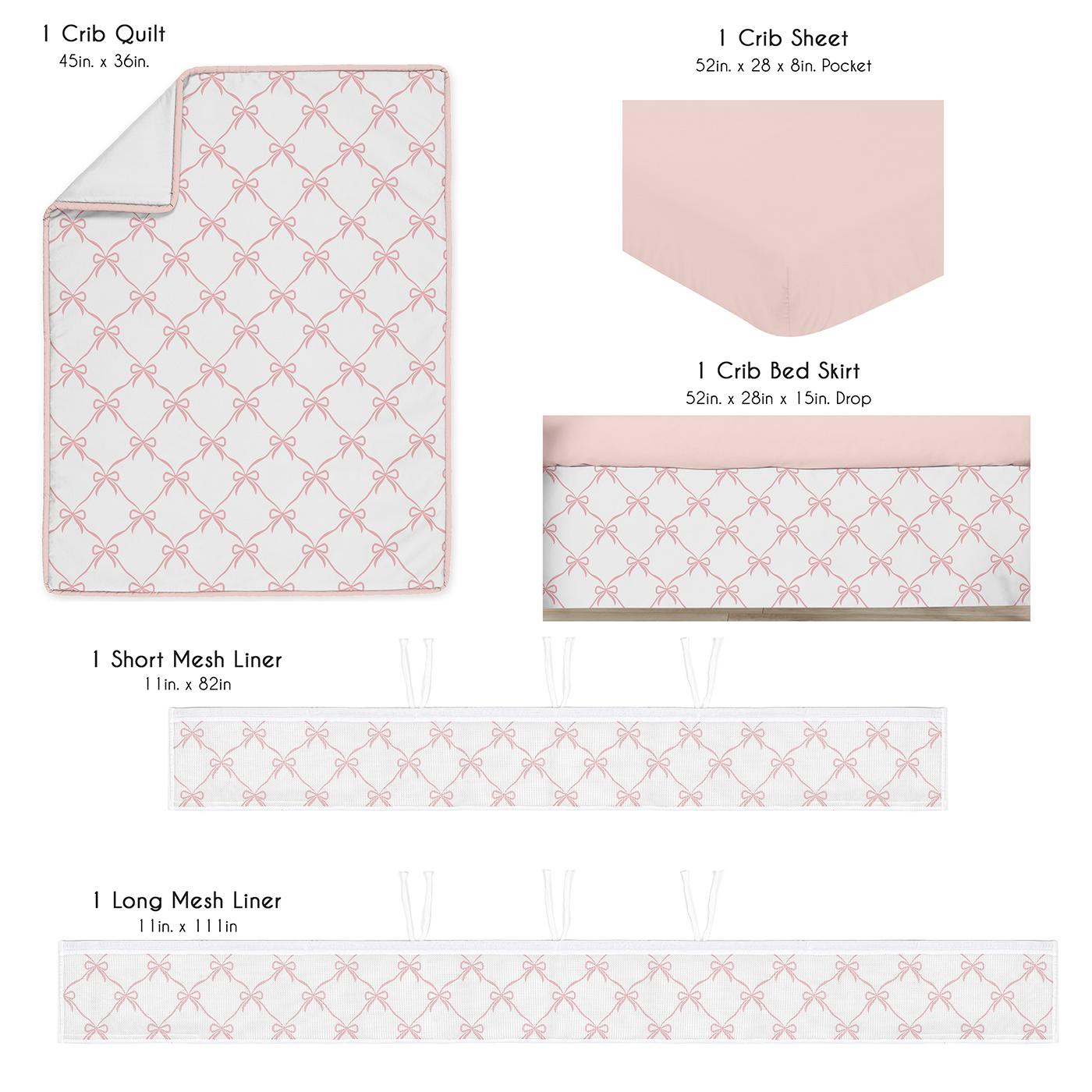 5 PIECE CRIB BEDDING SET INCLUDES: Crib Comforter (45in. x 36in.), Fitted Crib Sheet (52in. x 28in. x 8in. Pocket), Long Panel Mesh Liner (11in. x 111in.), Short Panel Mesh Liner (11in. x 82in.) and Crib Skirt (52in. x 28in. x 12in. Drop). This baby crib set is made of 100% polyester microfiber fabrics. This infant crib set includes all your baby essentials & features the shabby chic colors rose, blush pink and white to bring your elegant and girly baby room together.ELEGANT BOWS THEME: This baby girl crib bedding set boasts a crib blanket featuring a classic, vintage themed style, elegant, ballet dancer, bows print that reverses to a solid white. The straight crib skirt is adorned with a feminine, ballerina, bows print design. The solid color blush pink breathable crib sheet has elastic sewn around the bottom edge for a secure fit on most standard cribs. Machine washable. Tumble dry low.DESIGNED IN USA TO BE SAFE & DURABLE: As a proud Baby Safety Alliance member who rigorously tests products to meet or exceed CPSC safety standards, Sweet Jojo Designs is dedicated to creating high-quality products that blends style, comfort, and functionality. Our products are crafted with premium materials and details to support your baby's sleep and help parents design the perfect space for their little one. Trusted by families worldwide, Sweet Jojo Designs brings your nursery vision to life.PERFECT GIFT: Add baby girl crib set to your list of must haves! Including a toddler crib bedding set on your gift registry, in a baby shower gift basket or as a gender reveal present is an easy way to prepare for a baby's arrival. A quilt provides unique decor or a cuddle time blankie and fitted crib sheets provide a soft surface to sleep on. Crib bed skirt dust ruffles add a polished touch and can hide storage under the crib. Gift to someone special or keep this cribset for your little one.NURSERY DESIGN MADE EASY: If you have a room to decorate, we have endless coordinating options to help. A nursery theme can be planned around baby bedding set, which creates a stylish cohesive room without having to mix and match pieces. Sweet Jojo Designs makes decorating simple with matching crib sheets, toddler bedding sets, crib sheet sets, changing pad covers, milestone blankets, wall decor, decorative accessories, window treatments and more to complete the look of your baby room. Item# Ballet-BOW-LC-Crib-6
