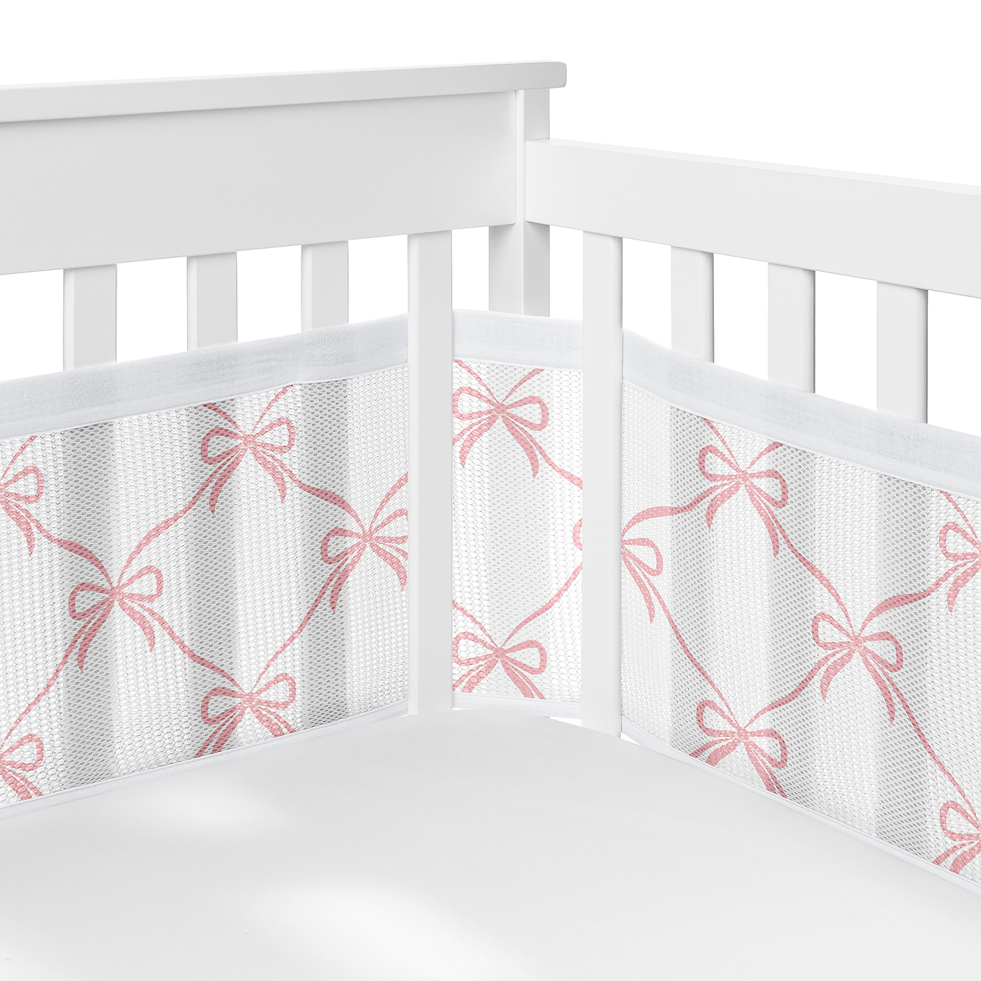 The 5pc Blush Pink and White Bows and Ballerina Princess baby bedding collection by Sweet Jojo Designs will create a boho shabby chic ballet look for your nursery. This classic feminine crib sets for girls uses a sensational collection of exclusive brushed microfiber fabrics. It boasts a print featuring flowy vintage style ribbons with bows tied into a dainty knot where each diamond meets and coordinating solid fabrics. The pretty floral color palette of rose blush pink and white will set up your infant's room in a sweet serene girly style. This crib bedding set includes a 100% polyester Sweet Jojo Designs + BreathableBaby mesh crib liner. Unlike bumper pads, this non-padded mesh crib liner is made with a single layer of breathable mesh, ensuring unrestricted airflow for your bundle of joy. It helps prevent baby’s arms and legs from getting caught in between slats, keeps pacifiers and binkies from dropping out of the crib in the middle of the night, AND matches your crib set. This Sweet Jojo Designs coquette aesthetic elegant baby girl bedding crib set will fit all standard cribs and toddler beds and is machine washable for easy care and repeated use. We know choosing a crib set for baby girl can be a big decision with so many themes and options out there, so why buy this baby girl nursery bedding set? Sweet Jojo Designs is a proud Baby Safety Alliance member, a woman-owned small family business and all products are designed in the USA. Sweet Jojo Designs products and baby crib sets are made of breathable fabrics and tested to meet or exceed CPSC safety standards. Sweet Jojo Designs creates various coordinating room accessories to match baby crib bedding sets for girls and for all of their children's bedding sets including wall decor, hampers, lampshades and window treatments.