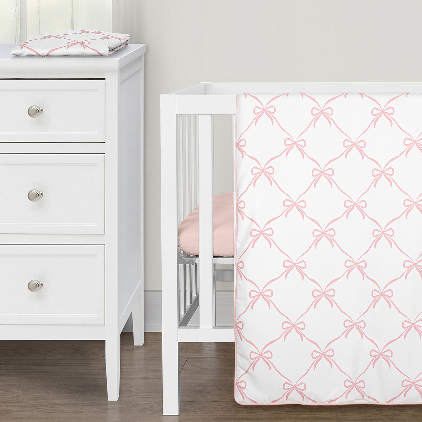 3 PIECE MINI CRIB SET INCLUDES: Baby Blanket (45in. x 36in.) & 2 Pack Fitted Mini Crib Sheets (24in. x 38in. x 5in. Pocket). Machine washable, tumble dry low. An infant porta crib set including baby essentials is a great value compared to purchasing pieces separately. This shabby chic baby portable crib set is made of soft microfiber fabric & features a classic, delicate & feminine ballet color palette of rose blush pink & white to bring your ballerina princess dancer themed baby room together.BOWS THEME: This baby girl mini portable crib bedding set boasts an elegant crib blanket featuring a print of coquette dainty ribbon style bows tied with a simple knot that reverses to an solid white. The solid blush pink and white & pink vintage elegant bows print set of 2 mini porta crib sheets have elastic sewn around the bottom edges for a secure fit on most standard portable cribs, pack n plays, mini cribs, playpens and porta cribs. WILL NOT FIT STANDARD SIZE CRIBS.DESIGNED IN USA TO BE SAFE & DURABLE: As a proud Baby Safety Alliance member who rigorously tests products to meet or exceed CPSC safety standards, Sweet Jojo Designs is dedicated to creating high-quality products that blends style, comfort, and functionality. Our products are crafted with premium materials to support your baby's sleep and well-being & help parents design the perfect space for their little one. Trusted by families worldwide, Sweet Jojo Designs brings your nursery vision to life.PERFECT GIFT: Add a baby girl mini bed set to your list of must haves! Including a portable bedding set on your gift registry, in a baby shower gift basket or as a gender reveal present is an easy way to prepare for a baby's arrival. A quilt provides unique decor or a cuddle time blankie and fitted crib sheets provide a soft surface to sleep on. Perfect for smaller spaces & furniture such as portable cribs, pack n plays, mini cribs, playpens, porta cribs, apartments, condos, shared rooms & more.NURSERY DESIGN MADE EASY: If you have a room to decorate, we have endless coordinating options to help. A nursery theme can be planned around mini portable baby bedding set, which creates a stylish cohesive room without having to mix & match pieces. Sweet Jojo Designs makes decorating simple with matching crib sheets, toddler bedding sets, crib sheet set, changing pad covers, milestone blankets, wall decor, decorative accessories, window treatments & more to complete the look of your baby room.Item# Ballet-BOW-MiniCrib-3