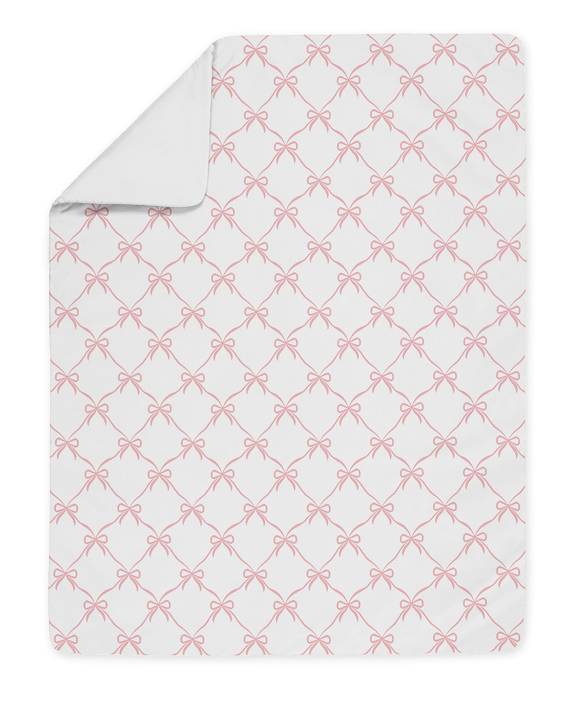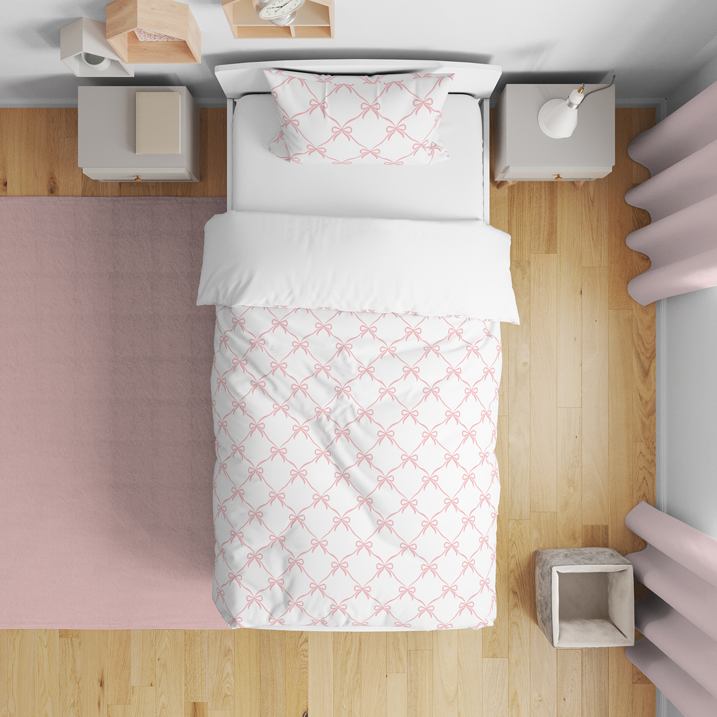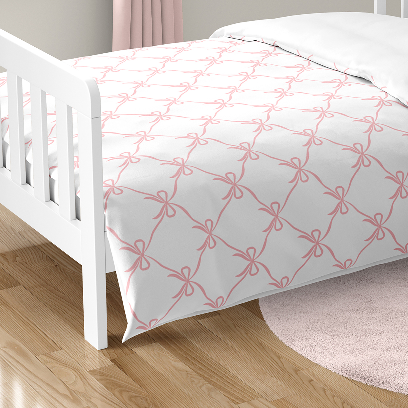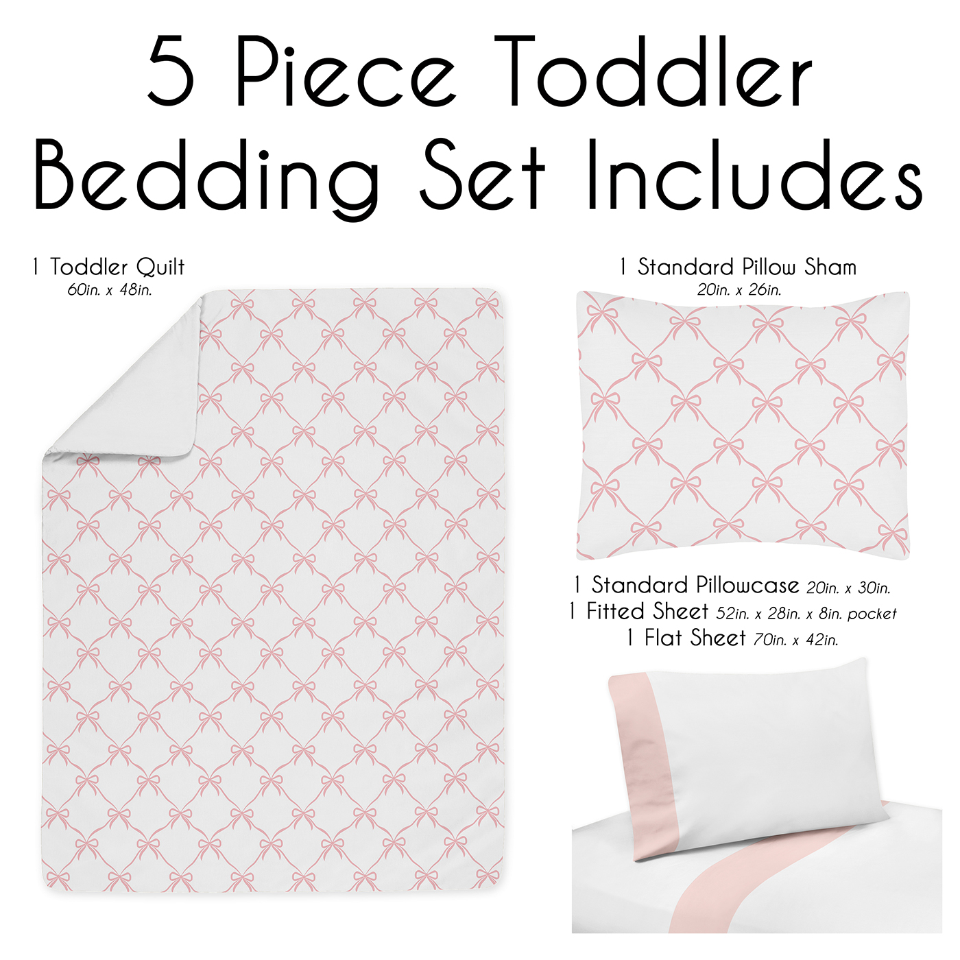 5 Piece Set Includes: (1)Toddler Comforter, (1)Sham, (1)Pillow Case, (1)Flat Sheet, (1)Fitted SheetComforter: 60 in. x 48 in., Standard Sham: 20 in. x 26 in., Standard Pillowcase: 20 in. x 30 in., Fitted Sheet: 52 in. x 28 in. x 8 in. pocket, Flat Sheet: 70 in. x 42 in.This set boasts a print featuring flowy coquette style ribbons with bows tied into a dainty knot where each diamond meets and delicate satin bows.This set is made of brushed microfiber fabric and is machine washable. Tumble dry lowThis design has matching accessories such as window treatments, hampers, shower curtains, memory photo boards, body pillow cases and decorative pillows.Item# Ballet-BOW-Tod