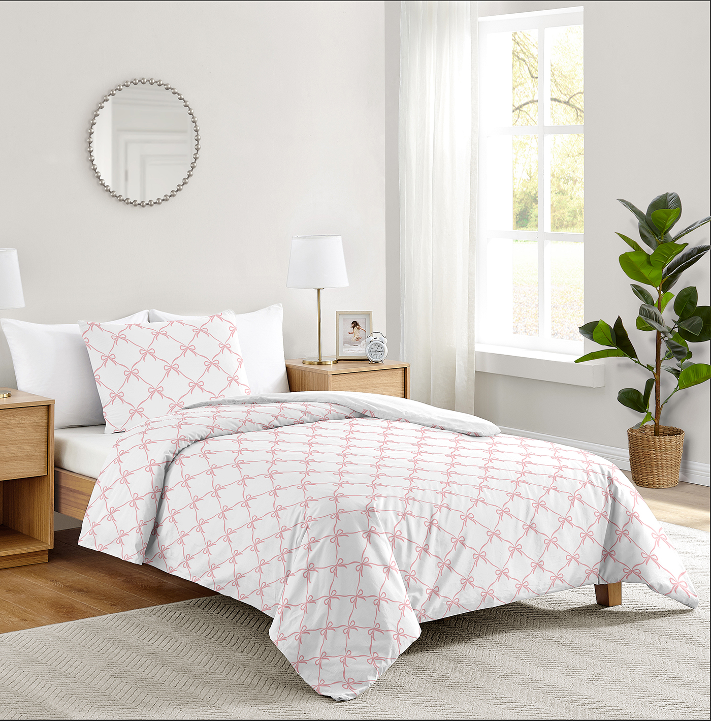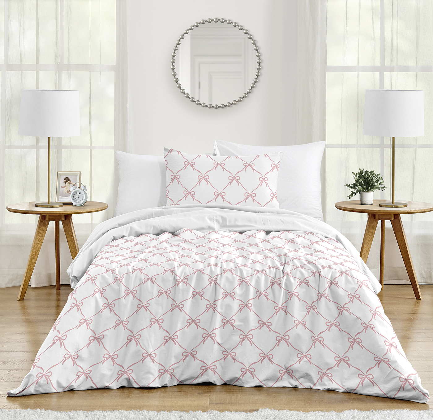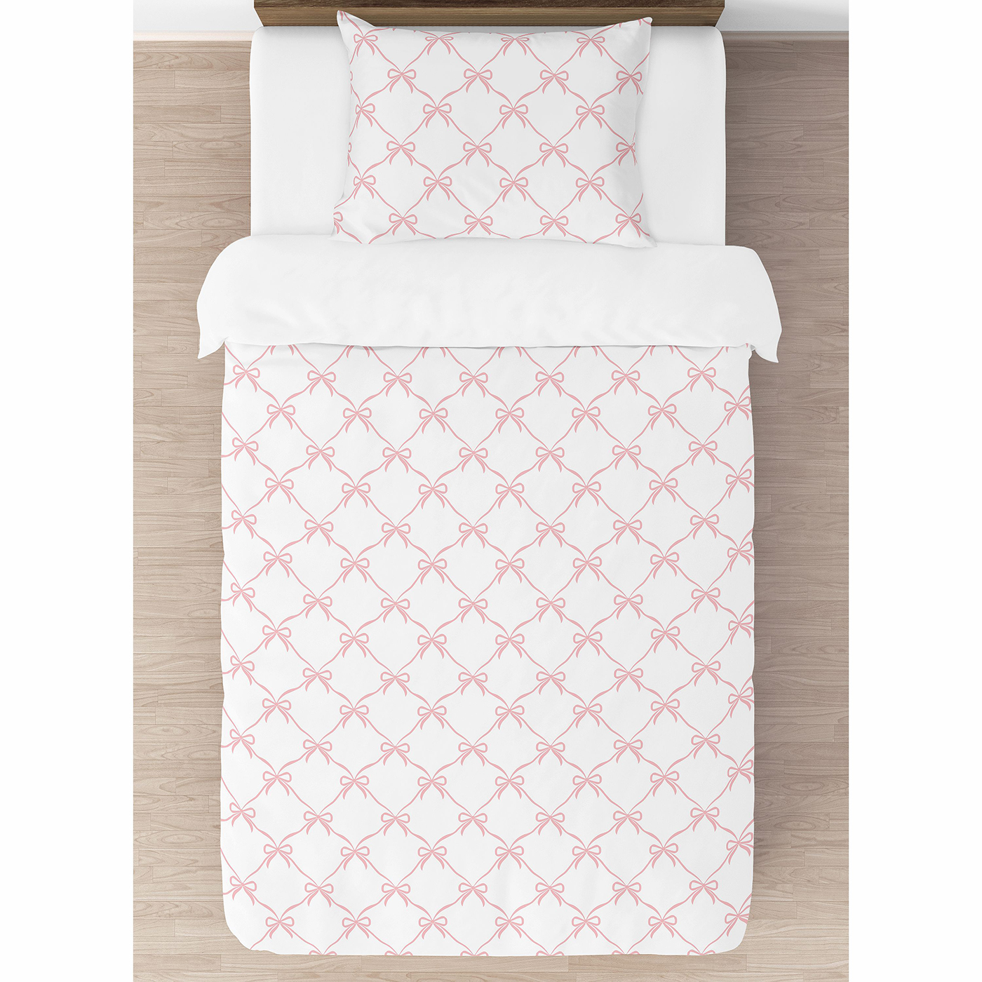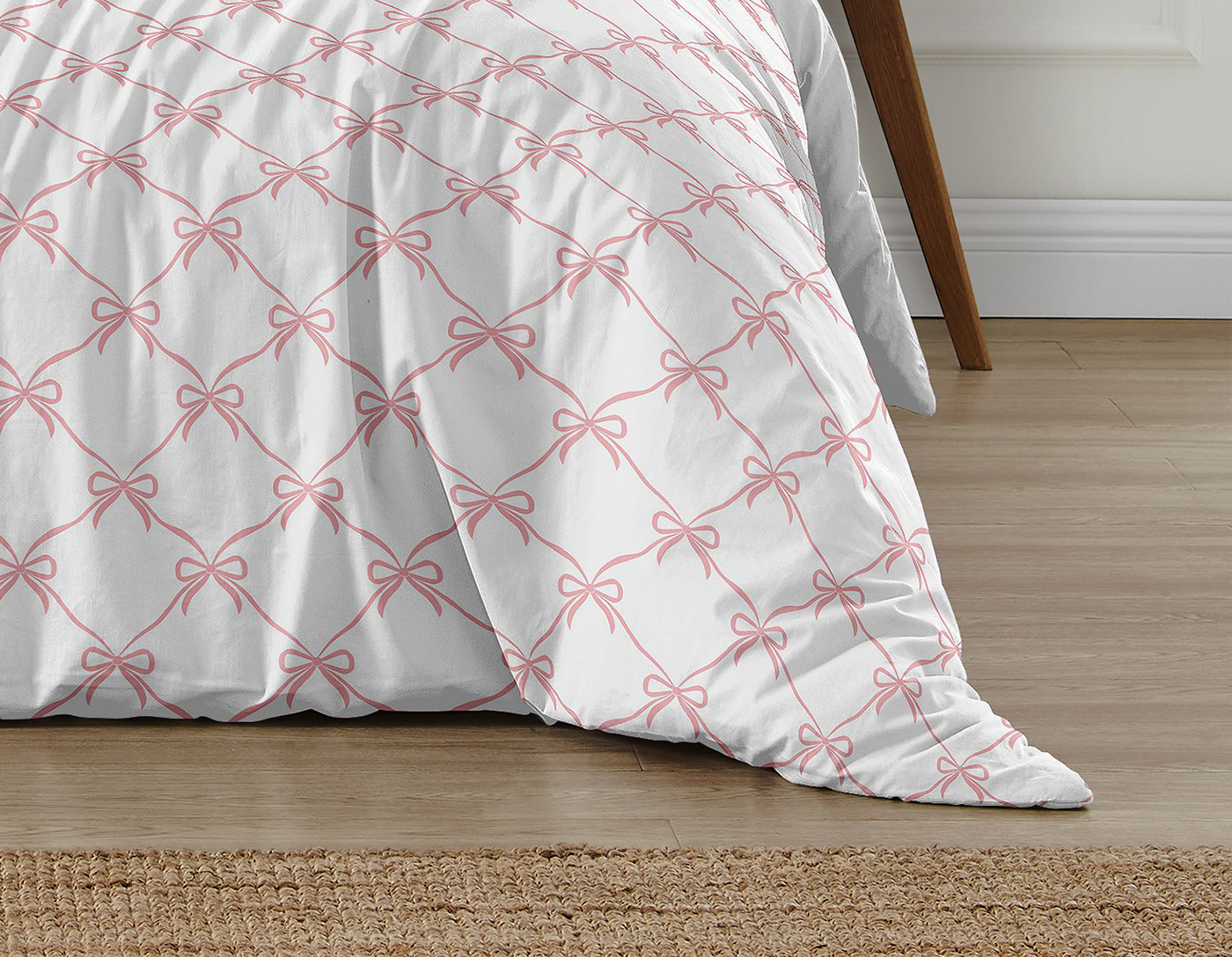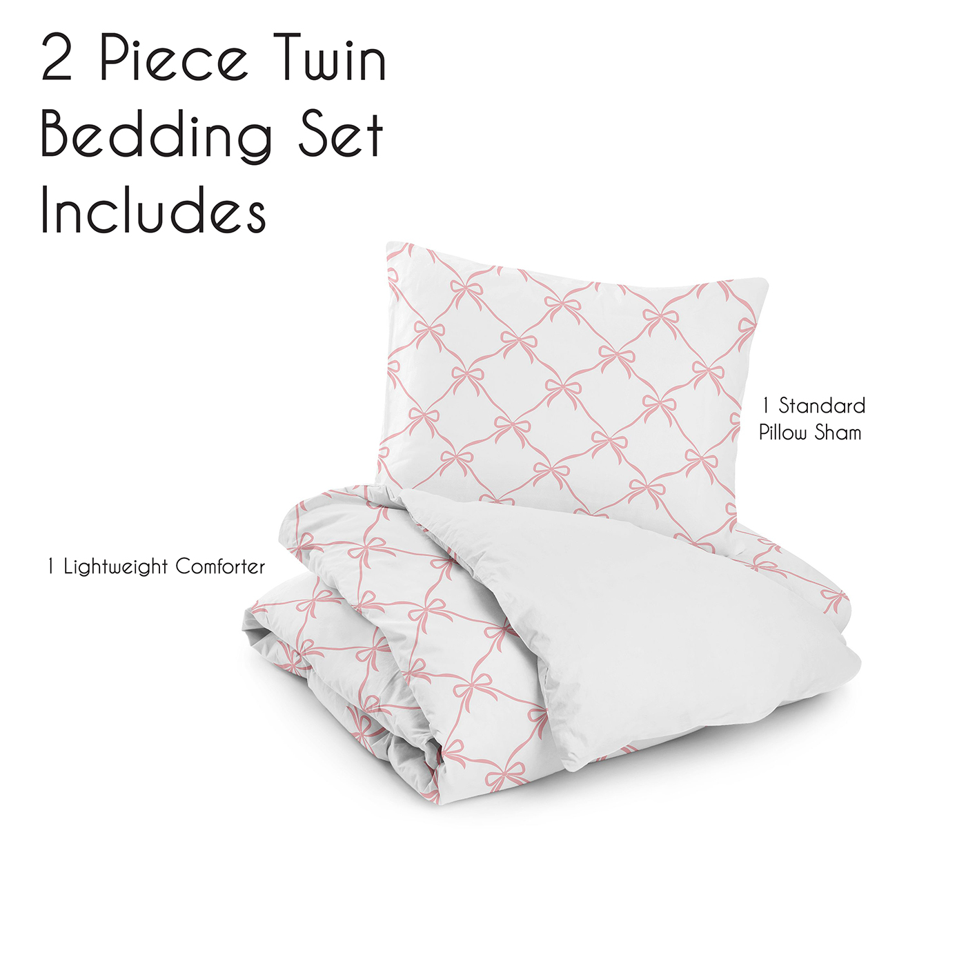2 PIECE TWIN BEDDING SET INCLUDES: 1 Lightweight Twin Comforter (62in. x 86in.), 1 Standard Sham (20in. x 26in.)RIBBON AND BOWS THEME: This set boasts a print featuring flowy coquette style ribbons with bows tied into a dainty knot where each diamond meets and delicate satin bows. Standard size pillow sham are made with the same print and reverses to the same bows print. This set is made of brushed microfiber fabric and is machine washable. Tumble dry lowDESIGNED IN THE USA: By real parents who understand the need for comfort, practicality, and style. Sweet Jojo Designs is a small, women owned business. The mom's on our team know kids bed sets are first priority for your essentials to ensure a restful night of sleep. We use top fabrics and designs to create soft bedding that's stretchy and comfortable for your toddler, child, or teen. We've studied the latest trends in girls twin size bedding to bring you the finest product.SAFE & DURABLE: Sweet Jojo Designs is a proud JPMA member and rigorously tests products to meet or exceed CPSC safety standards. Our breathable bedding is designed with busy parents in mind. Quick to change, easy machine washable and tumble dry on low. The high quality stitching and fabric ensure long-lasting use and will hold up wash after wash. Sweet Jojo Designs bedding sets make the perfect gift for child's room make over, kids birthdays, or teens going off the college. MATCHING DECOR & ACCESORIES: Purchasing a twin set from Sweet Jojo Designs offers a variety of benefits, ensuring both comfort & style for any bedroom. Each set is crafted from high-quality fabrics, providing soft bedding that promotes restful sleep. Sweet Jojo Designs adds a personalized touch to your space. We offer a wide variety of coordinating room decor such as hampers, window treatments, wall decor, sheet sets, shower curtains, memo boards, decorative pillows and more. Item# Ballet-BOW-Twin-4