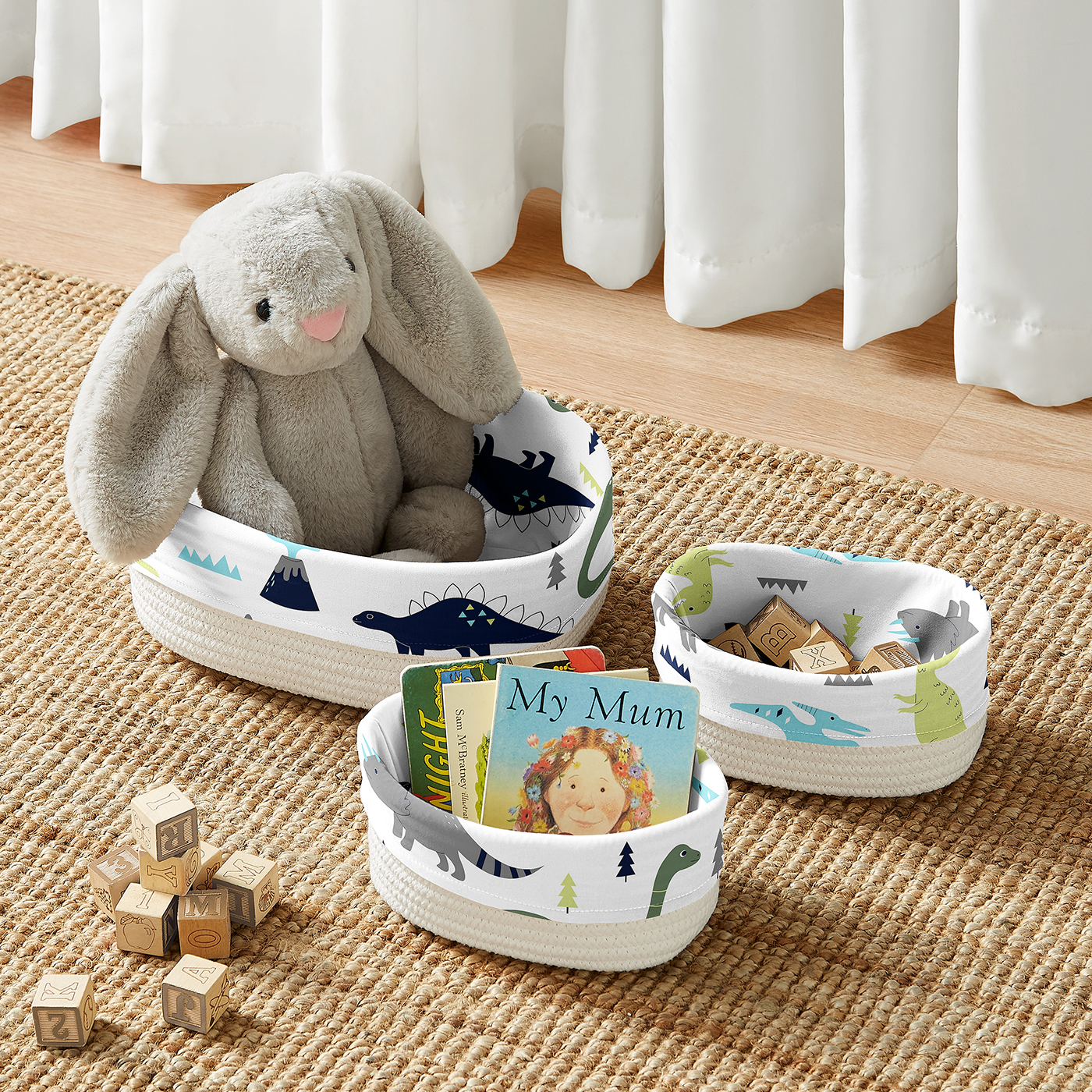 Instead of single use wrapping paper and gift bags, use this 3 piece storage bin set, which makes the perfect unique gift basket for gender reveal and baby shower presents to hold coordinating Sweet Jojo Designs nursery crib sheets, bibs, burp cloths changing pad covers, nursing pillow covers, multi-use covers, swaddles, and baby blankets.Item# Basket-3P-ModDino-BU-GR-PRT