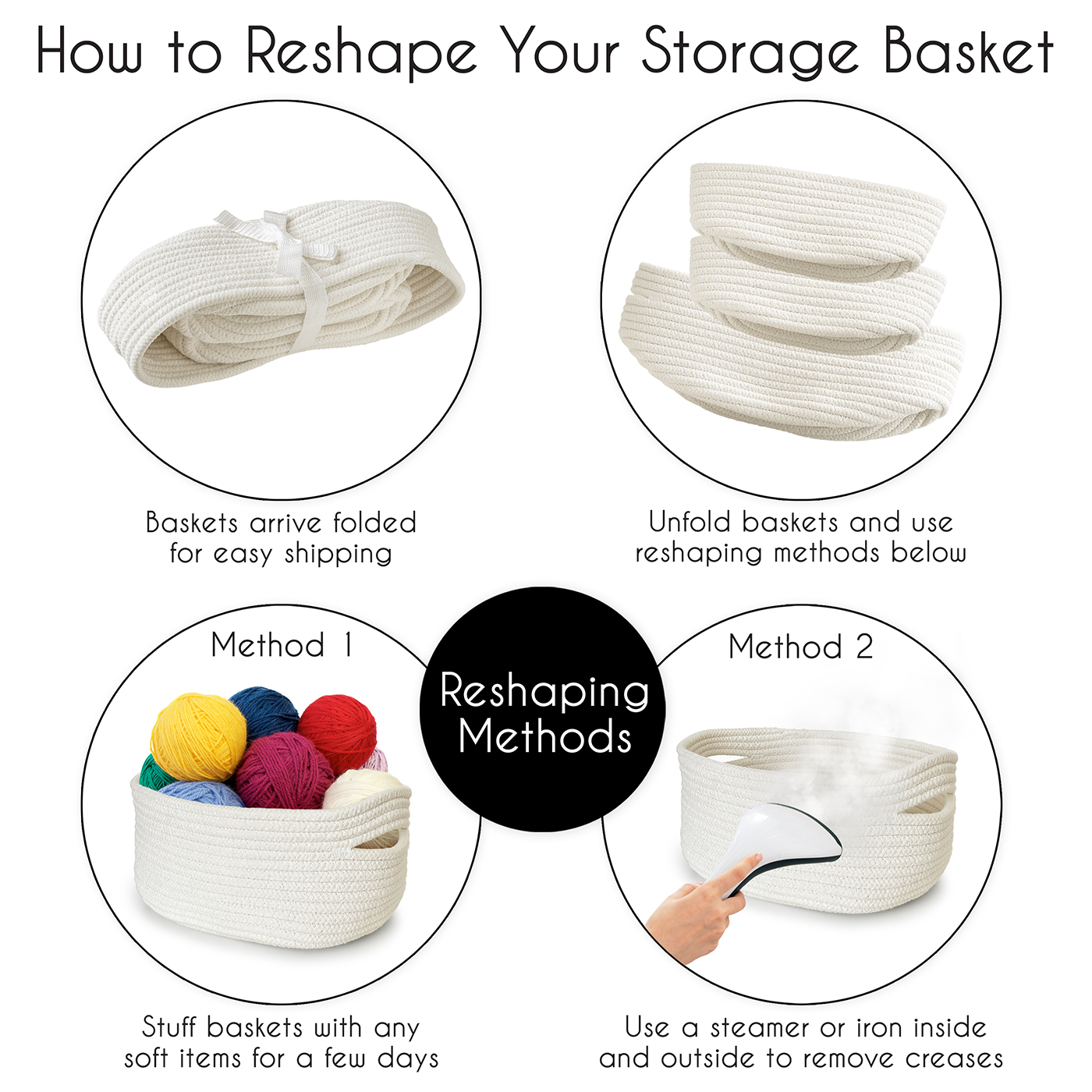 Materials: Cotton Rope Baskets: Spot clean as needed; 95% Rayon 5% Spandex Jersey Liner Fabric – Machine wash, cold tumble dry low.