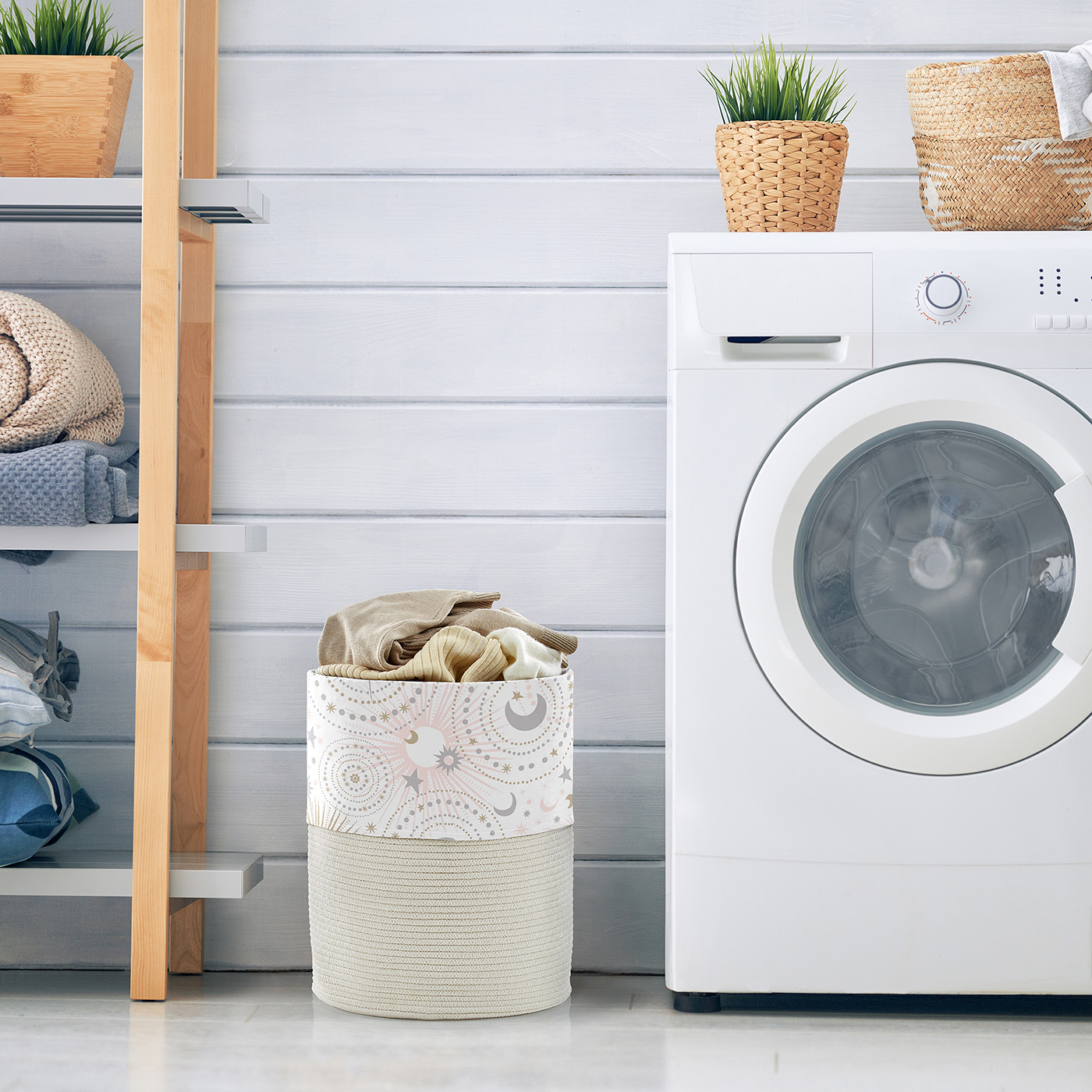 Elevate your storage and laundry organization needs with a decorative Sweet Jojo Designs large sized woven laundry basket with liner. This versatile woven hamper is an ideal alternative to rattan wicker baskets and can be used as your new laundry bin or double as a spacious storage basket to decorate your nursery, bedroom, livingroom, playroom, home office, laundry room, kids bed room, closet, family room, den, attic, basement, classroom, college dorm, apartment, guest room, bathroom, foyer, kitchen, pantry, home theater, gaming room, home gym, and garage. This multifunctional laundry hamper comes with a removeable fabric liner to easily transport dirty clothes back and forth from the mud room or laundromat to your bedroom and throw in the washer for a quick clean. Purchase as many as you need to use the boho cotton rope storage basket to store all your newborn and child essentials, such as blankets, toys, stuffed animals, comforters, duvets, cushions, clothing and throw pillows. Or use it in other parts of the home as a functional decoration to stash clutter, clothes, shoes, linens, towels, wash cloths, and books. These lined baskets are made from a flexible and foldable material for easy space saving storage when not in use. When ready to use, steam or iron inside and outside of the rope hamper to remove creases. Our exclusive stretchy jersey fabric lined basket coordinates with our crib bedding sets, twin or queen bed sheets, window valances and room decor accessories to give you a complete look for any room in your home.