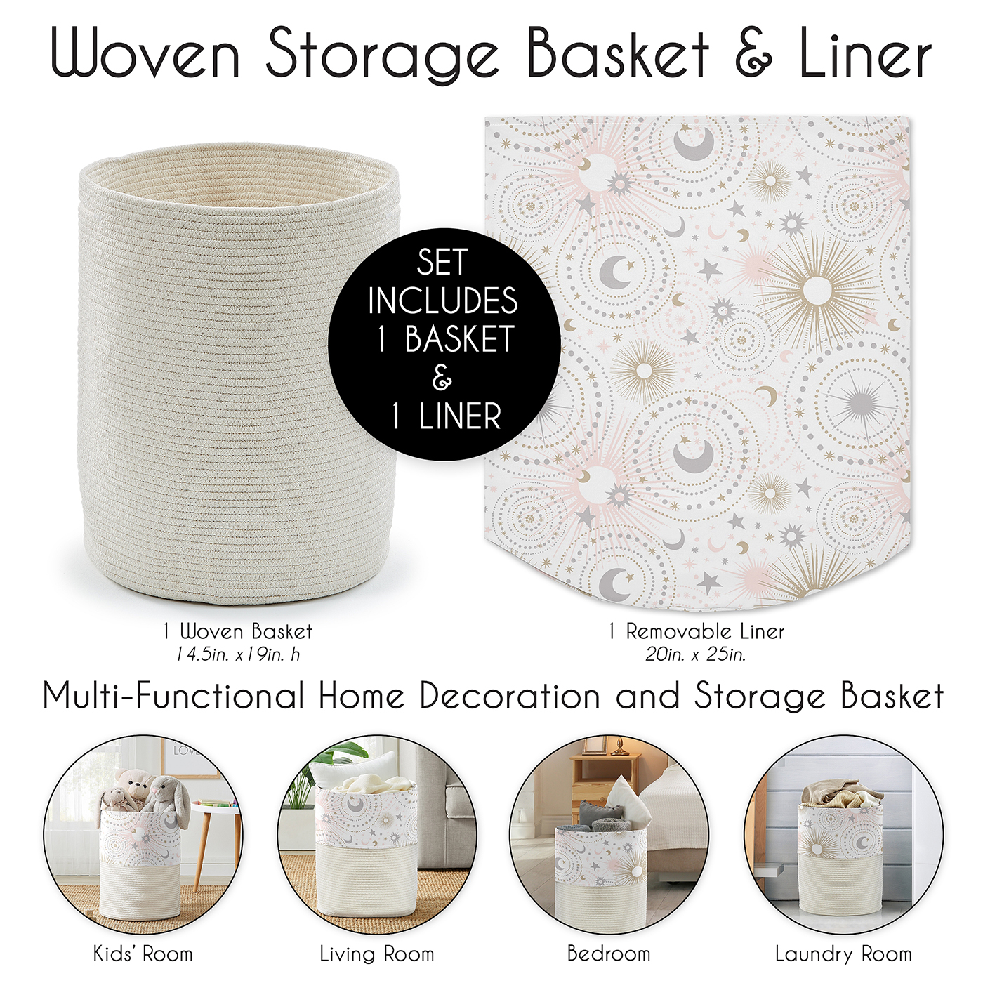 Jersey fabric basket liner featuring exclusive design of blush pink gray gold and grey shabby chic celestial space sky moon and stars on a neutral off white ivory cotton rope woven basket.
