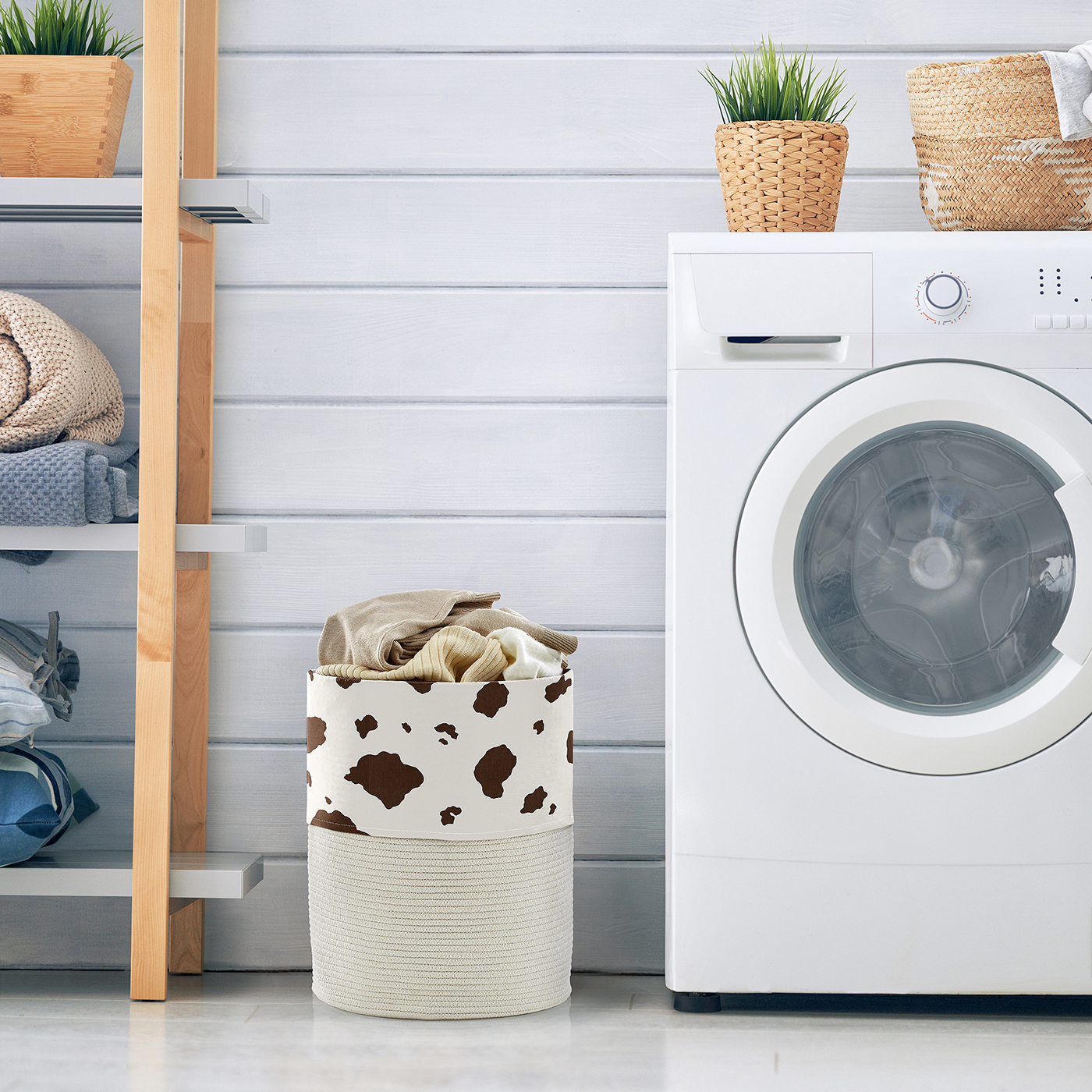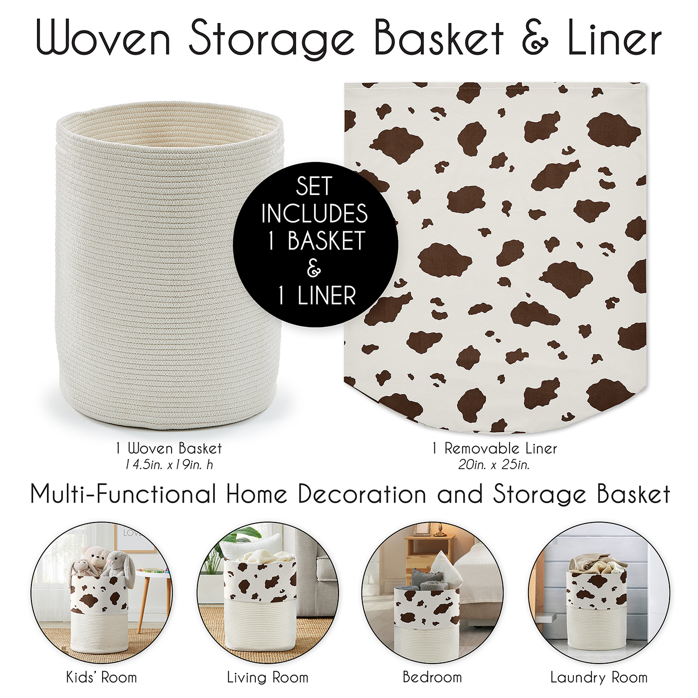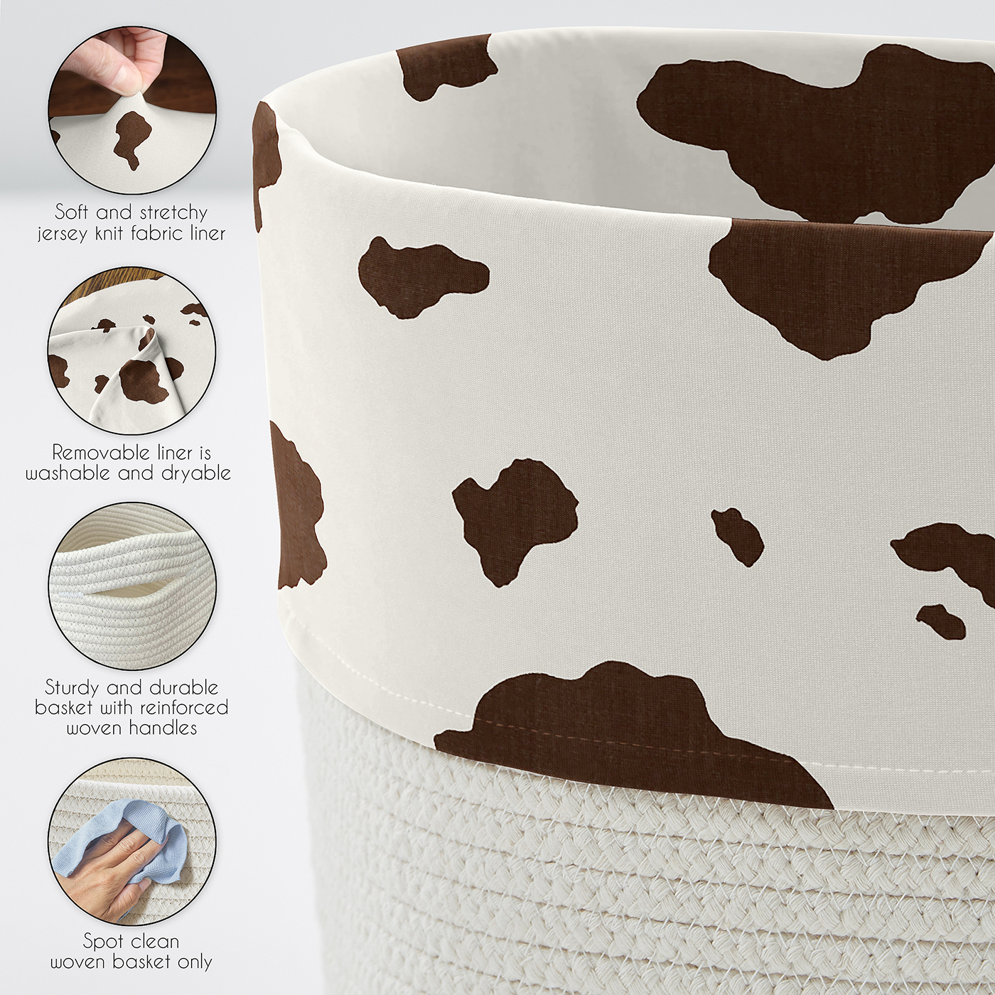 Jersey fabric basket liner featuring exclusive design of chocolate brown and cream gender neutral southern charm country wild west steer animal south western animal cow print on a neutral off white ivory cotton rope woven basket.
