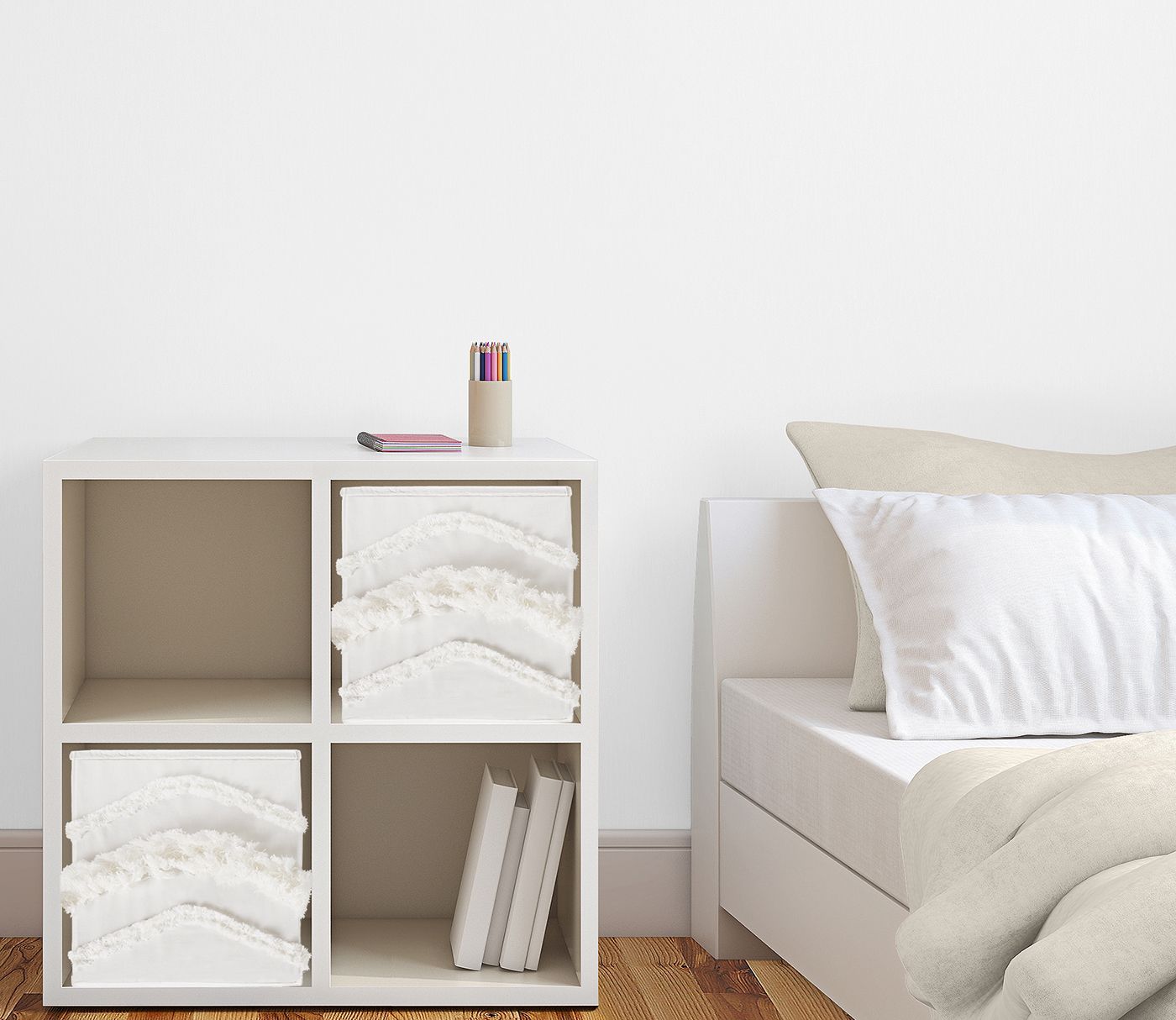 Reinforced fabric handles allow bins to easily slide in and out of most standard cube shelving