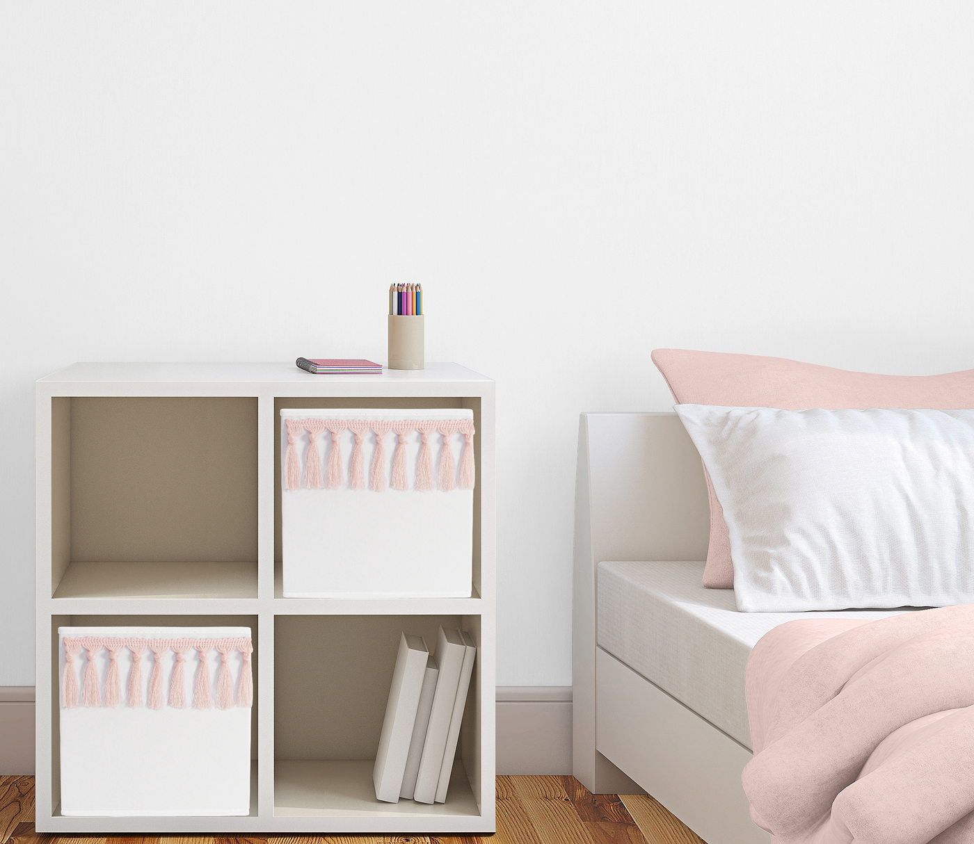 Reinforced fabric handles allow bins to easily slide in and out of most standard cube shelving