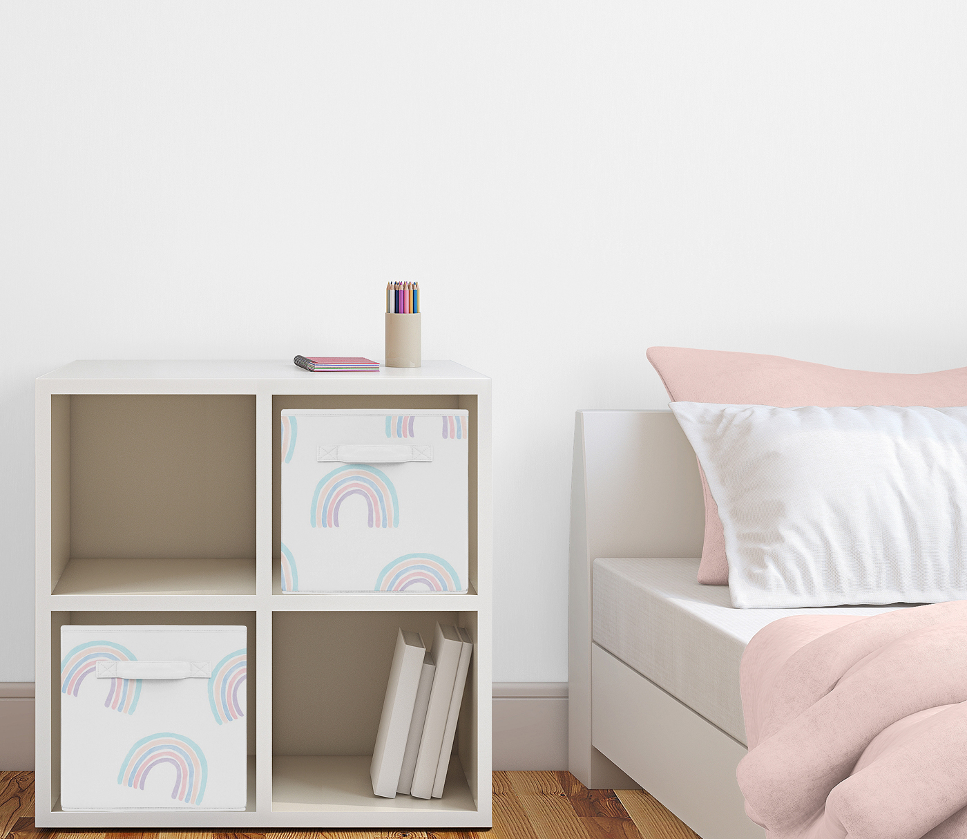 Reinforced fabric handles allow bins to easily slide in and out of most standard cube shelving