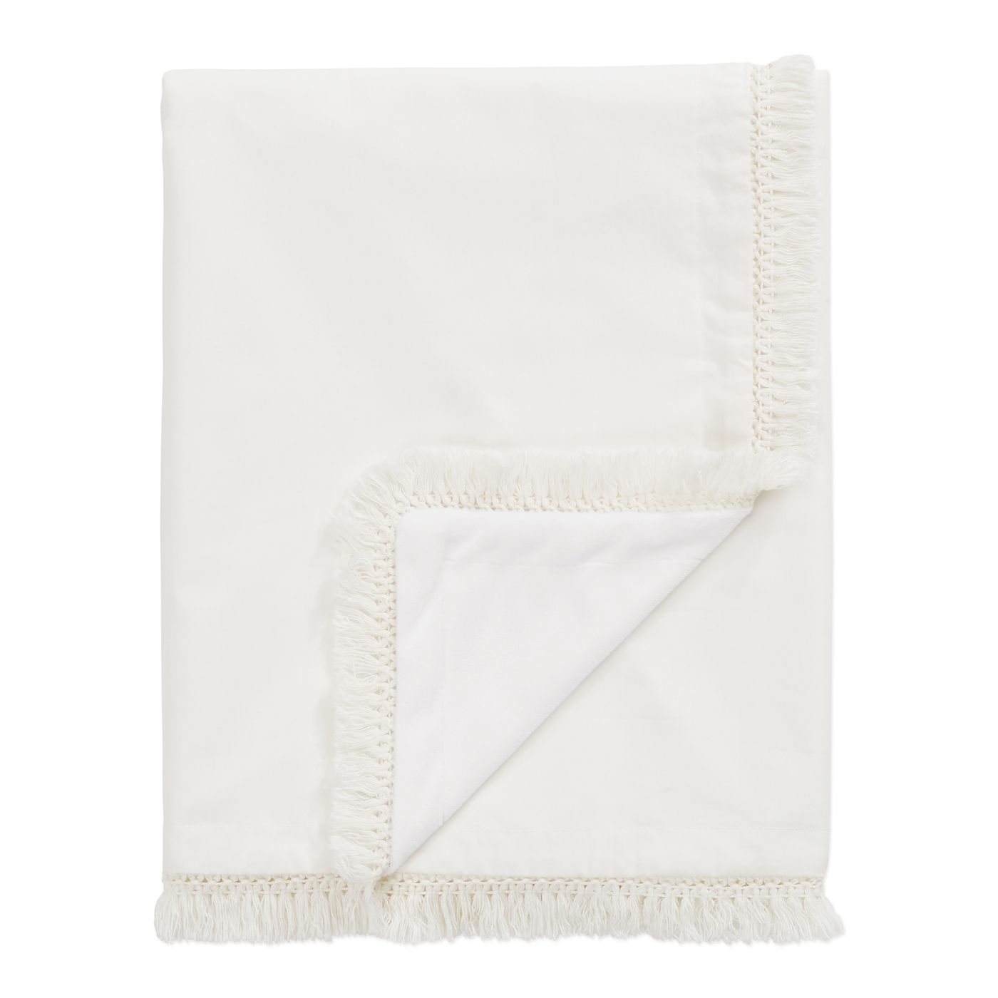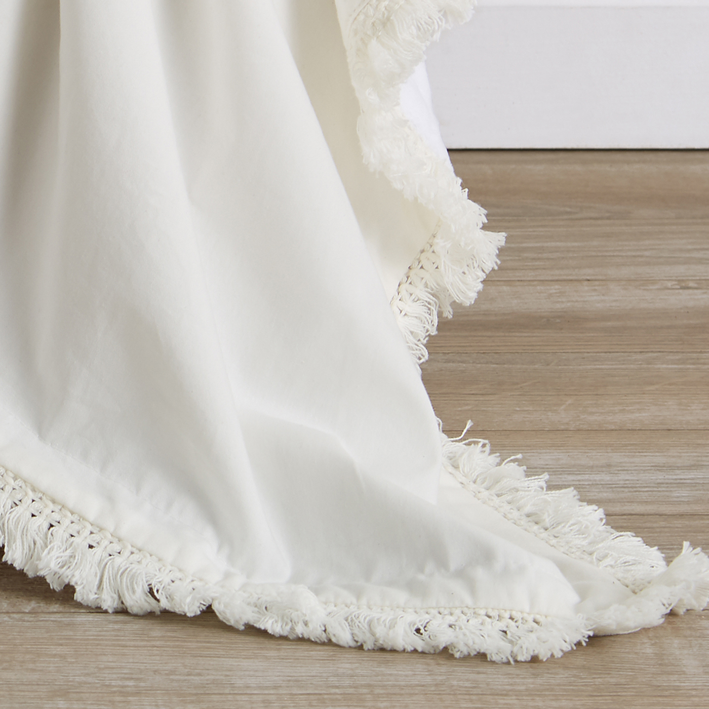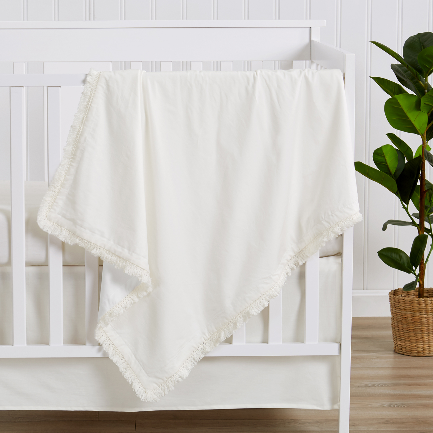 Blanket is designed using a solid ivory cotton and is finished with a knotted tassel macrame trim. It reverses to soft white minky