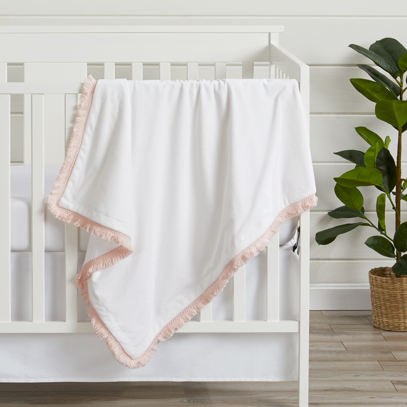Blanket is designed using a solid white cotton and is finished with a blush pink knotted tassel macrame trim. It reverses to soft white minky
