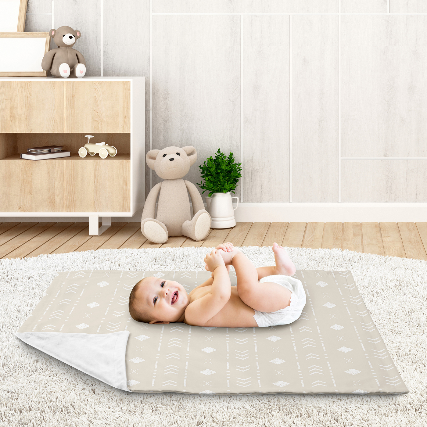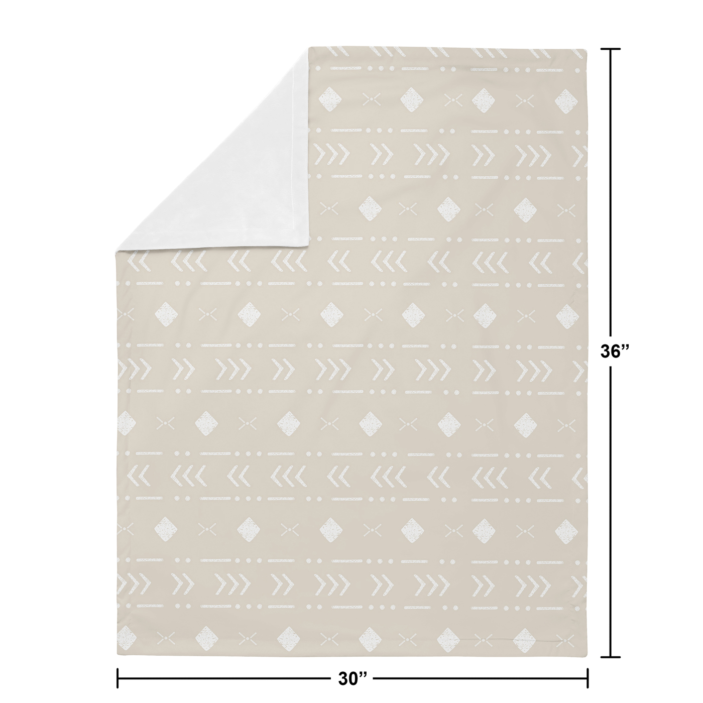 Blanket is designed using a taupe and white boho aztec geometric brushed microfiber print and reverses to soft white minky