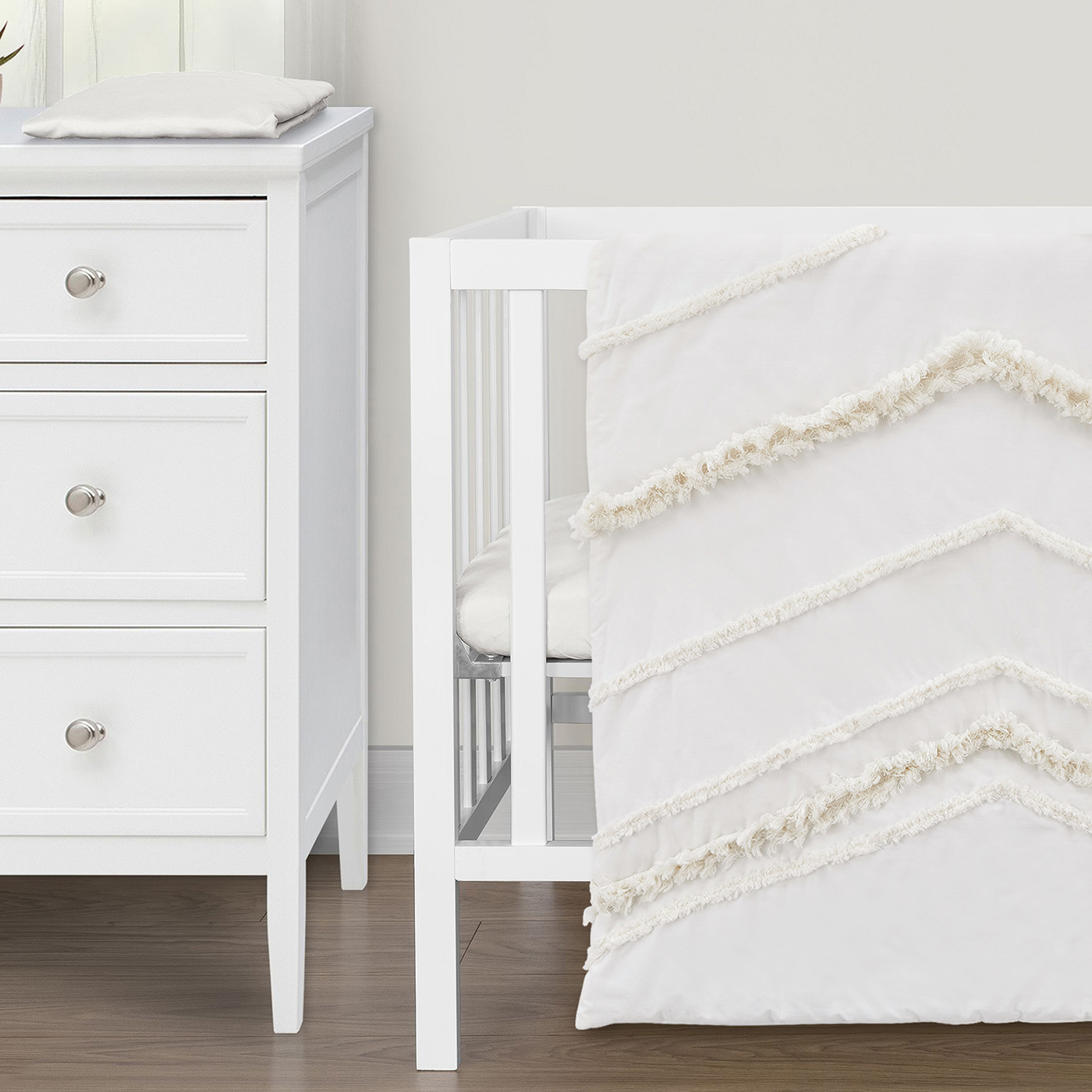 This 100% cotton gender neutral mini crib bedding set features a solid color ivory cream modern boho chic bohemian farmhouse knotted tassel macrame fringe and tufted trimmings comforter and two off white mini sheets with fully elastic bottom for secure fit. WILL NOT FIT STANDARD SIZE CRIBS.