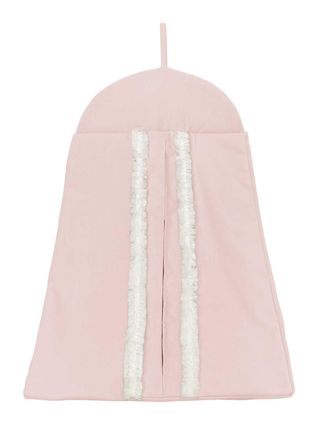 The perfect baby shower gift! All your baby room essentials can be found in one set for your nursery. Newborn blanket features a blush pink and ivory tufted trim and reverses to a solid blush pink. Ultra soft crib mattress sheet is made with cotton. Crib bed skirt dust ruffle features solid blush pink and off white macrame tassels. This set is made complete with the coordinating diaper stacker, featuring ties to conveniently hang anyplace in the bedroom to store diapers.