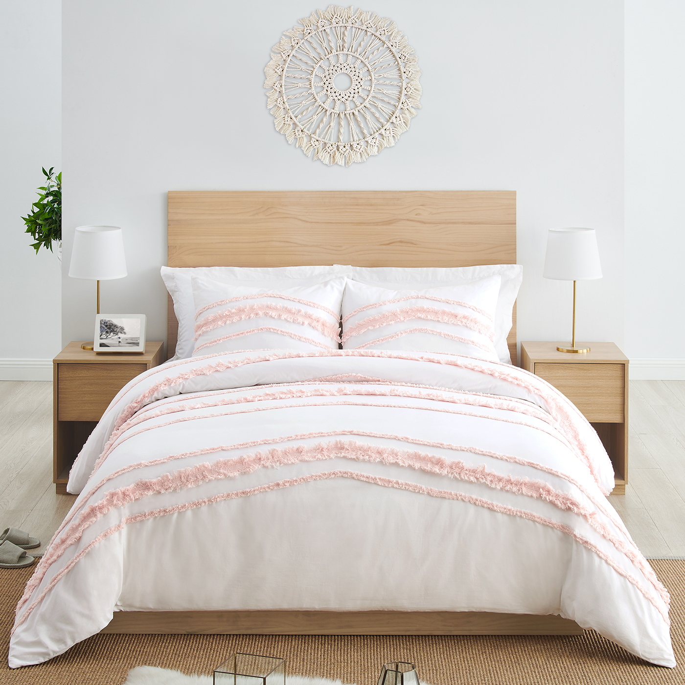 3PC QUEEN BEDDING SETS FOR GIRLS INCLUDES: Lightweight Comforter (86in. x 86in.) & Set of 2 Standard Shams (20in. x 26in.). Easy machine washable and dryable on low. This delicate and feminine tufted fringe full size comforter sets for girls is made with super soft, moisture wicking 100% washed cotton fabric and features the soft girly color palette of blush pink and white will bring together this tufted fringe, classic, modern, minimalist look.BOHO ELEGANT THEME: This queen girls bedding set boasts a soft blanket & pillow case shams. The bed comforter features blush pink knotted tassel macrame fringe and tufted trimmings. This queen bed set has matching pillow shams with the same design that effortlessly makes them a standout addition to any kids bedroom decor. If you're looking for a minimalist bohemian & whimsical aesthetic for your room makeover, this bed comforter set is the perfect focal point.DESIGNED IN THE USA: By real parents who understand the need for comfort, practicality, & style. Sweet Jojo Designs is a small, women owned business. The mom's on our team know a full size comforter sets is first priority to ensure a restful night sleep. Crafted with premium materials to create a soft full bed comforter that pairs easily with room decor & is comfortable for you or your little one. We've studied the latest trends in bed in a bag queen comfort sets to bring you the finest product.MATCHING DECOR & ACCESORIES: Purchasing a girls queen bedding set from Sweet Jojo Designs offers a many benefits. If you have a room to decorate, we have endless options to help. An interior design theme can be planned around a bedding comforter set, creating a cohesive space without mixing & matching. Sweet Jojo Designs adds a personalized touch to your space with a wide variety of coordinating room decor such as window treatments, wall decor, sheet sets, shower curtains, memo boards and more.PERFECT GIFT: Queen bedding sets for girls that include bedding comforters & shams offers convenience & savings & should be #1 on your bedroom makeover essentials necessities list! Queen bed comforter sets make a unique & thoughtful birthday gift, graduation present, college dorm care package, house warming gifts, or Easter basket stuffers for kids, teens, & adults. This practical gift idea provides comfort & warmth through the all seasons comforter & pillow protection through pillowcase shams.Item# BohoFringe-WH-PINK-Q-3