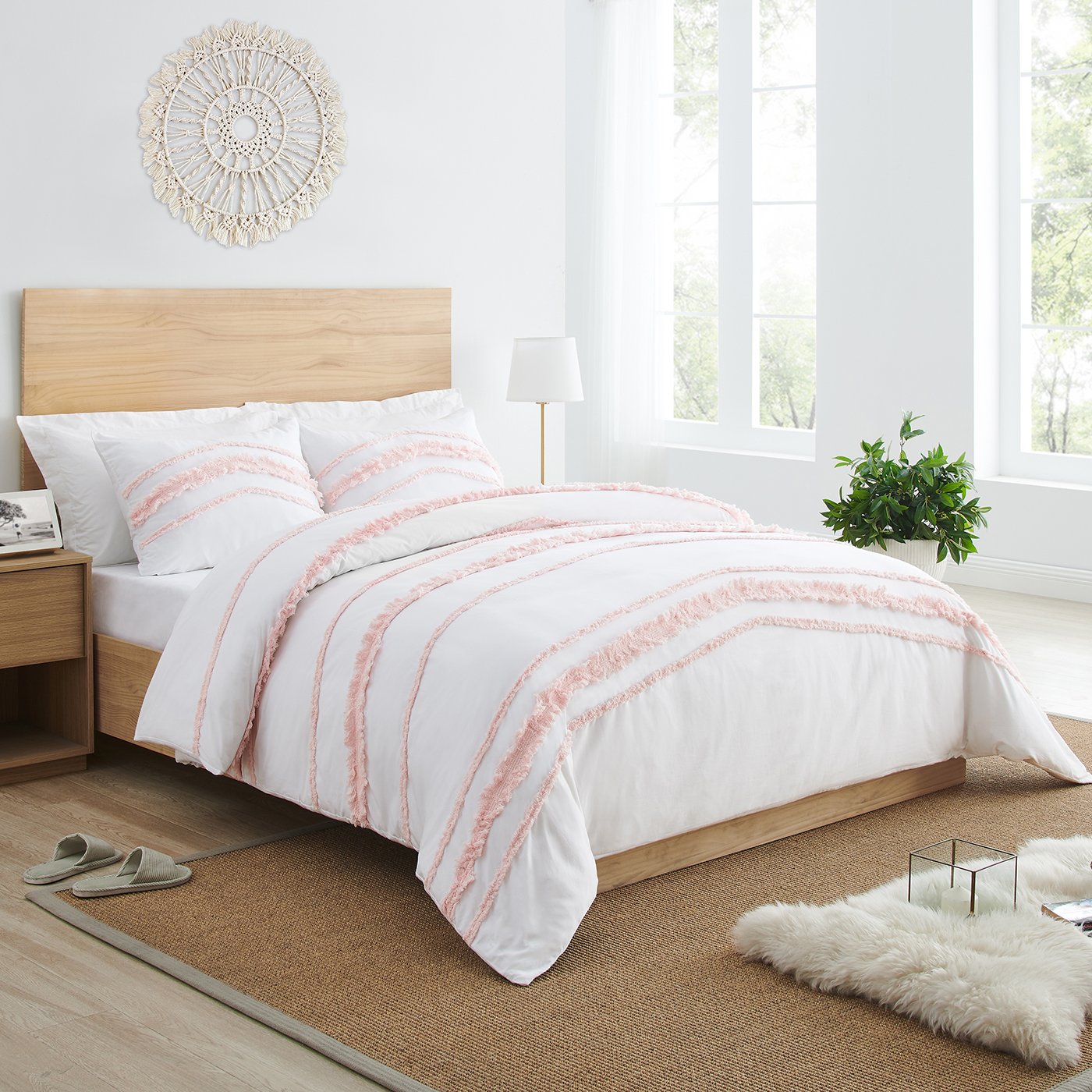2PC TWIN BEDDING SETS FOR GIRLS INCLUDES: Lightweight Comforter (62in. x 86in.) & Standard Sham (20in. x 26in.). Easy machine washable and dryable on low. This delicate and feminine tufted fringe twin comforter set for girls is made with super soft, moisture wicking 100% washed cotton fabric and features the soft girly color palette of blush pink and white will bring together this tufted fringe, classic, modern, minimalist look.BOHO ELEGANT THEME: This twin girls bedding set boasts a soft blanket & pillow case sham. The bed comforter features a blush pink bohemian knotted tassel macrame fringe and tufted trimmings. This twin bed set has a matching pillow sham with the same design that effortlessly makes them a standout addition to any kids bedroom decor. If you're looking for a minimalist & whimsical aesthetic for your kids room makeover, this bed comforter set is the perfect focal point.DESIGNED IN THE USA: By real parents who understand the need for comfort, practicality, and style. Sweet Jojo Designs is a small, women owned business. The mom's on our team know a twin size comforter sets is first priority to ensure a restful night of sleep. Crafted with premium materials to create a soft single bed comforter that pairs easily with room decor and is comfortable for you or your little one. We've studied the latest trends in bed in a bag twin to bring you the finest product.MATCHING DECOR & ACCESORIES: Purchasing a girls twin bedding set from Sweet Jojo Designs offers a many benefits. If you have a room to decorate, we have endless options to help. An interior design theme can be planned around a bedding comforter set, creating a cohesive space without mixing & matching. Sweet Jojo Designs adds a personalized touch to your space with a wide variety of coordinating room decor such as window treatments, wall decor, sheet sets, shower curtains, memo boards and more.PERFECT GIFT: Twin bed sets for girls that include bedding comforters & sham offers convenience & savings & should be #1 on your bedroom makeover essentials or dorm necessities list! Twin bed comforter sets make a unique & thoughtful birthday gift, graduation present, college care package, house warming gifts, or Easter basket stuffers for kids, teens, & adults. This practical gift idea provides comfort & warmth through the all seasons comforter & pillow protection through the pillowcase sham.Item# BohoFringe-WH-PINK-Twin-4