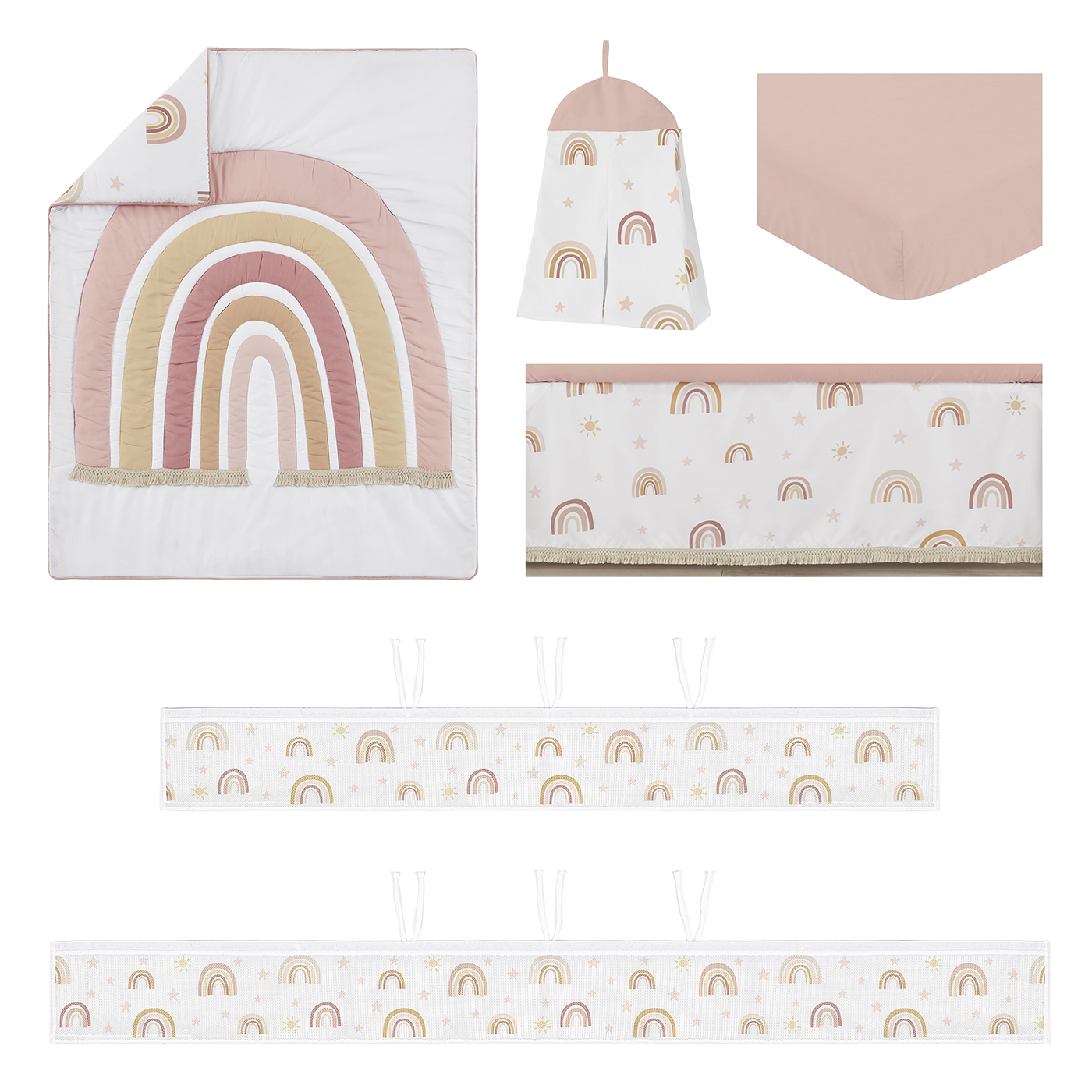 6 Piece Set Includes: Baby blanket, fitted sheet, crib skirt, BreathableBaby mesh crib liner (2 piece set) and diaper stackerDimensions: Crib Blanket: 45 in. x 36 in., Fitted Crib Sheet: 52 in. x 28 in. x 8 in. pocket, Crib Skirt: 52 in. x 28 in. x 15 in. Drop, Diaper stacker: 15 in. x 20 in. x 6 in., Long Panel Mesh Liner: 11in. x 111in. and Short Panel Mesh Liner: 11in. x 82in.This set boasts a modern hand drawn multicolored rainbow celestial sky print featuring dusty pink, rose, gold, taupe, beige, and tan with solid fabrics and accented with brush fringe macrame detailsThe crib bedding set is made of brushed microfiber fabric and is machine washable; tumble dry low. The BreathableBaby mesh crib liner baby nursery is made of 100% polyester and is machine washable. Wash separately. Machine wash warm gentle cycle. Only non-chlorine bleach when needed. Tumble dry low.Sweet Jojo Designs offers matching accessories such as crib sheets, changing pads, wall decor, window treatments, storage solutions, and much more. This design is also available in crib, toddler, twin, and queen bedding sets.Item# BohoRainbow-Crib-6