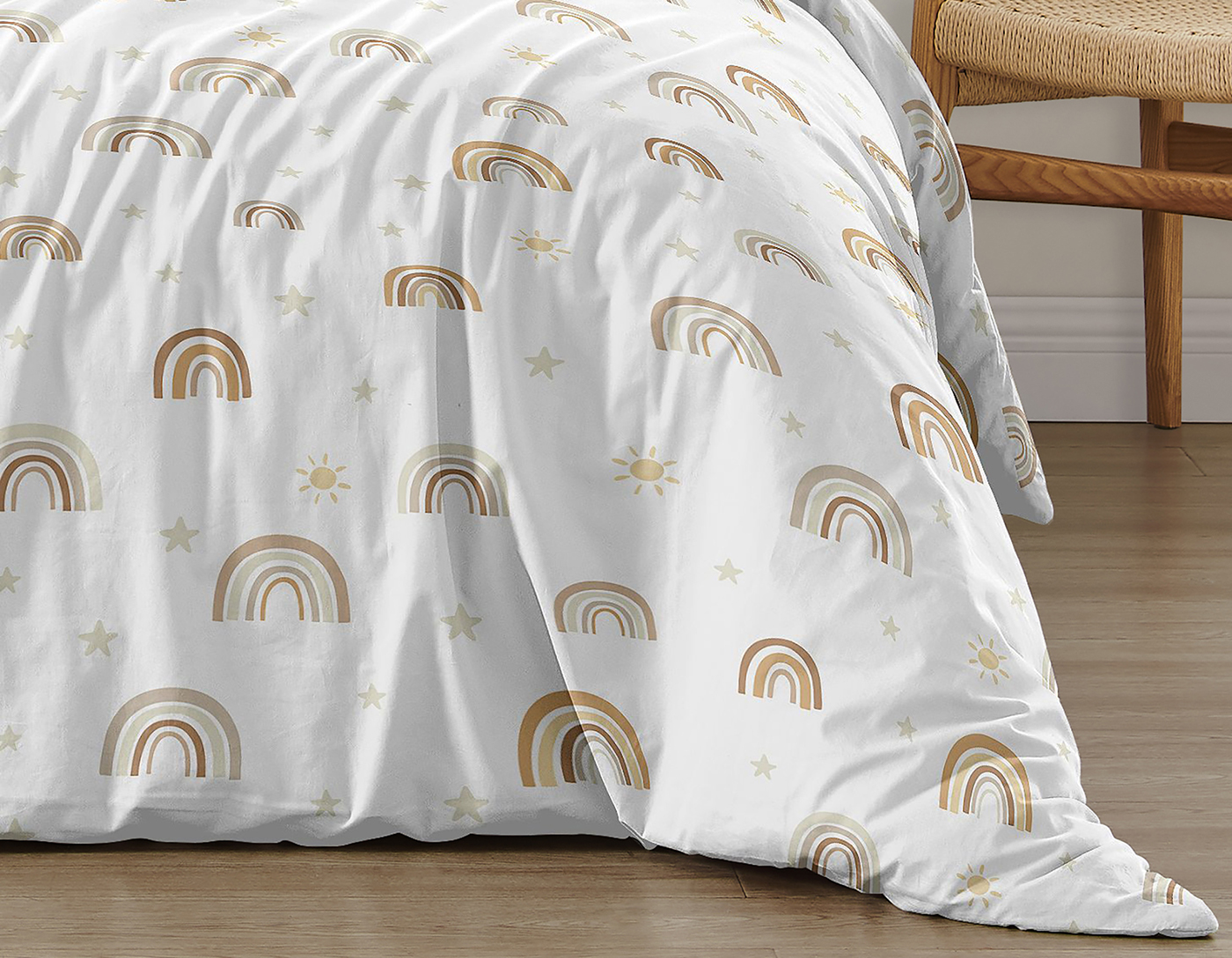 The 4pc Boho Rainbow Taupe twin bedding collection by Sweet Jojo Designs will create a fun and modern look for your bedroom. This vintage bohemian unisex bedding set uses a sensational collection of exclusive brushed microfiber fabrics and features a hand drawn multicolored rainbow print. The neutral color palette of mustard yellow, pumpkin orange, gold, taupe, beige and tan will set your bedroom up in sunshine style. This Sweet Jojo Designs set is machine washable for easy care and repeated use.