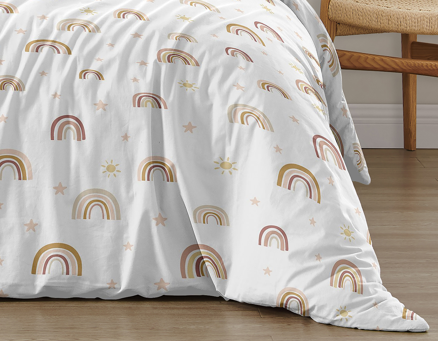 2PC TWIN BEDDING SETS FOR GIRLS INCLUDES: Lightweight Comforter (62in. x 86in.) & Standard Sham (20in. x 26in.). Easy machine washable and dryable on low. This vibrant and colorful twin comforter set for girls is made with super soft, moisture wicking brushed microfiber fabric and features eye-catching color palette of blush pinks, yellows, oranges, dusty rose, gold, beige, tan, mauves and taupe will bring together this fashionable, whimsical rainbow fairytale look for your bedroom. BOHO RAINBOWS THEME: This twin girls bedding set boasts a soft blanket & pillow case sham. The bed comforter features s hand drawn neutral modern, celestial, sky, vintage multicolored rainbow print. This twin bed set has a matching pillow sham with the same print that effortlessly makes them a standout addition to any kids bedroom decor. If you're looking for a boho chic aesthetic for your kids room makeover, this bed comforter set is the perfect focal point.DESIGNED IN THE USA: By real parents who understand the need for comfort, practicality, and style. Sweet Jojo Designs is a small, women owned business. The mom's on our team know a twin size comforter sets is first priority to ensure a restful night of sleep. Crafted with premium materials to create a soft single bed comforter that pairs easily with room decor and is comfortable for your little one. We've studied the latest trends in bed in a bag twin to bring you the finest product.MATCHING DECOR & ACCESORIES: Purchasing a girls twin bedding set from Sweet Jojo Designs offers a many benefits. If you have a room to decorate, we have endless options to help. An interior design theme can be planned around a bedding comforter set, creating a cohesive space without mixing & matching. Sweet Jojo Designs adds a personalized touch to your space with a wide variety of coordinating room decor such as window treatments, wall decor, sheet sets, shower curtains, memo boards and more.PERFECT GIFT: Twin bed sets for girls that include bedding comforters and sham offers convenience and savings and should be #1 on your bedroom makeover essentials or den room necessities list! Twin bed comforter sets make a unique & thoughtful birthday gift, Christmas presents, holiday treat, sleepover care package, or Easter basket stuffers for kids or teens. This practical gift idea provides comfort and warmth through the all seasons comforter & pillow protection through the pillowcase sham. Item# BohoRainbow-Twin-4
