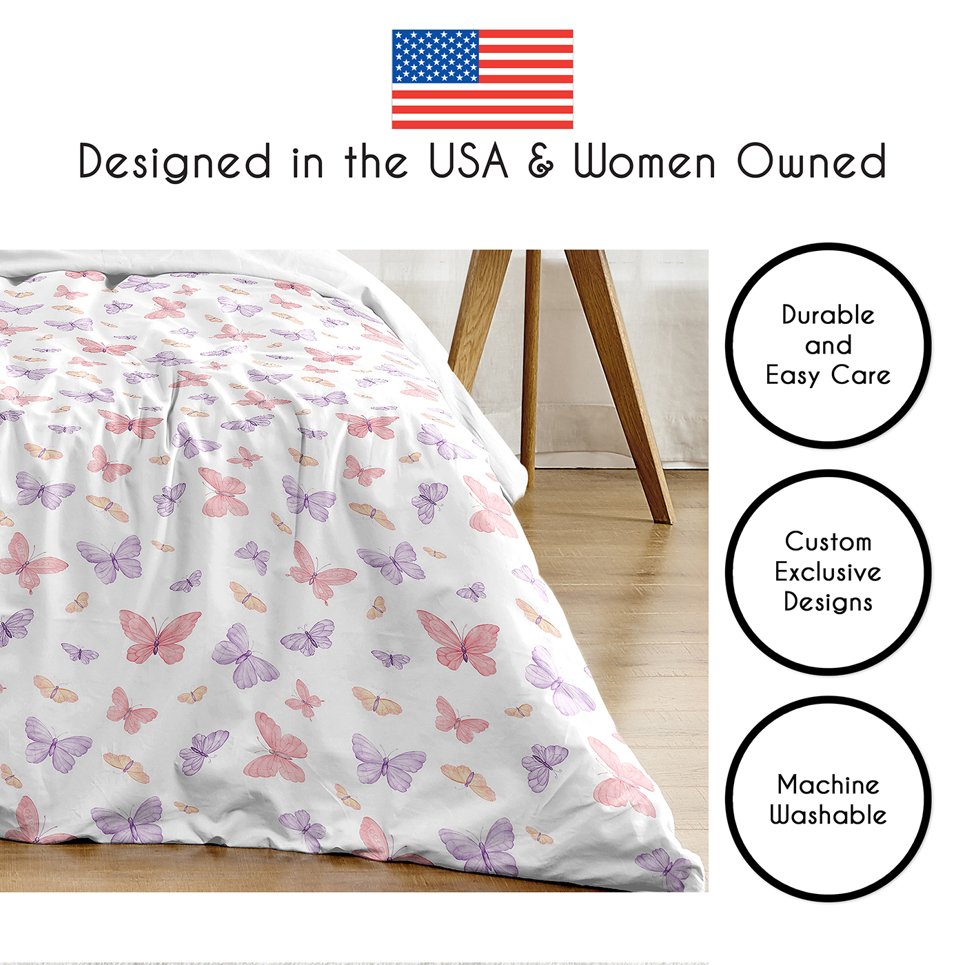 Transform your or your child's bedroom into a cozy and stylish retreat with our 3pc Pink and Purple Butterfly kids bedding sets for girls by Sweet Jojo Designs. Designed for people who love both style and comfort, this queen size bedding set features vibrant colors and fun patterns. This full size bedding comforter sets for girls uses a sensational collection of exclusive, brushed microfiber fabrics. This all-in-one queen bed in a bag set includes a super-soft microfiber queen blanket and matching pillow shams, offering the perfect blend of warmth, comfort and durability. The soft comforter features a hand painted watercolor scenery print complete with fluttering butterflies. The soft pastel color palette of purple, lavender, yellow and delicate shades of blush pinks will create the shabby chic bedroom. There is no age limit to style! Perfect for all ages - whether you're looking for a queen bedspreads for adults or a fun, themed kids queen size bedding set, this versatile collection has you covered with the perfect childrens and full queen bedding set. Our full bedding sets for adults provide softness & quality, making it perfect for those who appreciate luxury bedding without the hefty price tag. Whether you're updating your guest bedroom essentials, need dorm bedding, or upgrading your child's room, this queen bedding set is a must-have. This girls bedding sets queen by Sweet Jojo Designs will fit all standard queen size beds and is machine washable for easy care and repeated use.