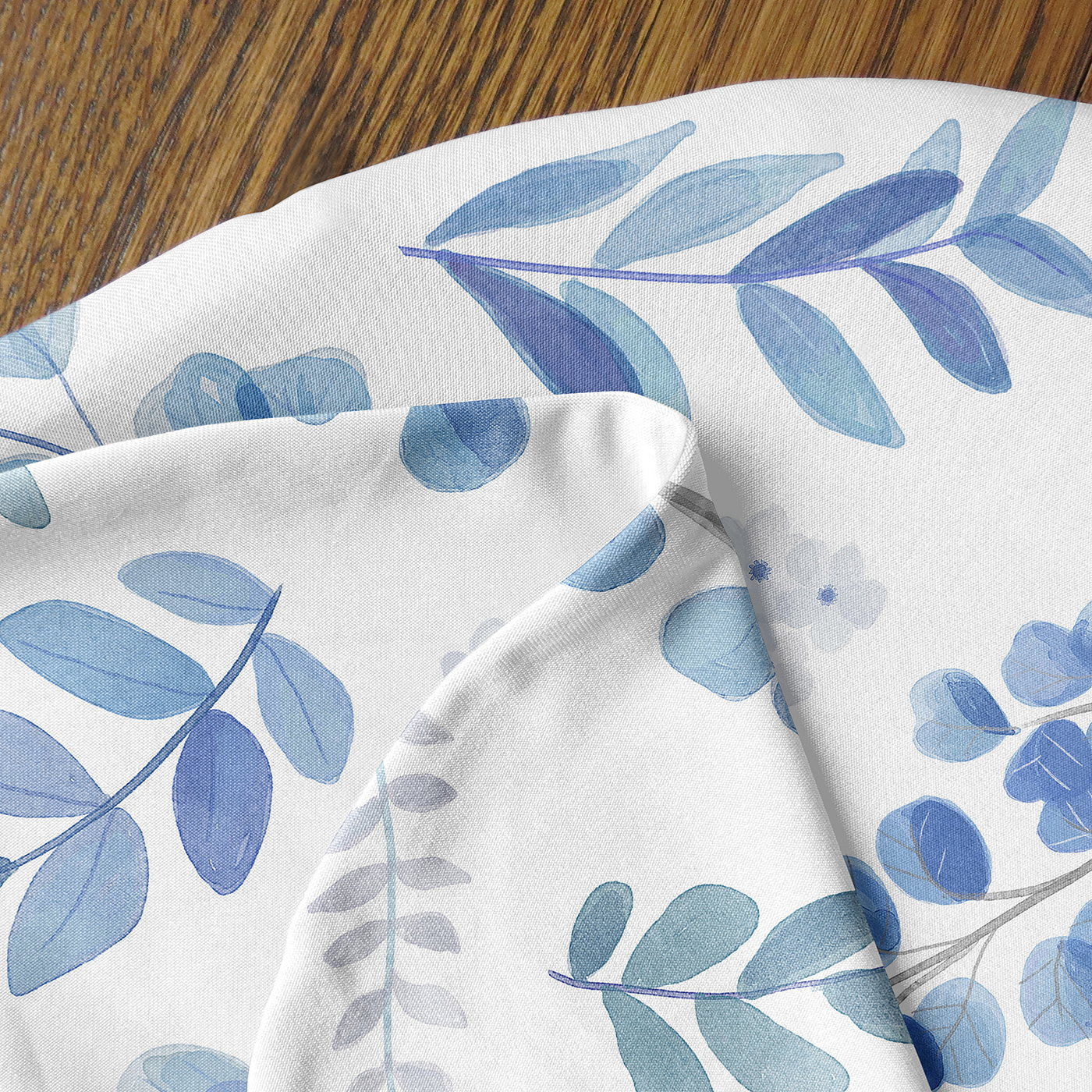 95% Rayon/5% Spandex Jersey Stretch Knit featuring blue, grey and white botanical floral leaves
